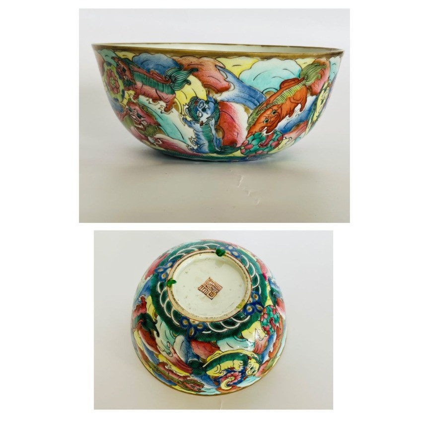 Antique Famille Rose Lion Bowl. No defects found. Origin unknown but research reveals it to be quite old. No provenance on this piece. Antique items offered for auction on the Site are sold “as is”. We endeavor to describe and display the items accurately and truthfully; however, we cannot guarantee the accuracy or reliability of any item’s description or condition. We strongly encourage all bidders to review images, descriptions, and condition reports and to contact us for additional information prior to bidding.