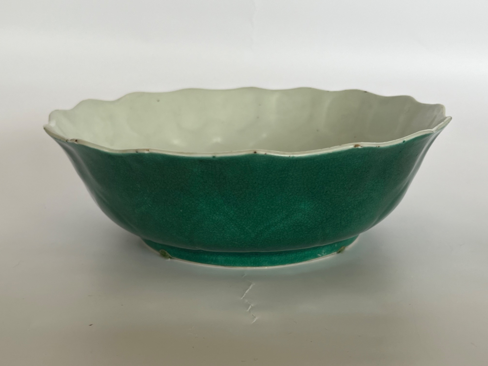 Antique Chinese Green Bowl. Antique items offered for auction on the Site are sold “as is”. We endeavor to describe and display the items accurately and truthfully; however, we cannot guarantee the accuracy or reliability of any item’s description or condition. We strongly encourage all bidders to review images, descriptions, and condition reports and to contact us for additional information prior to bidding.