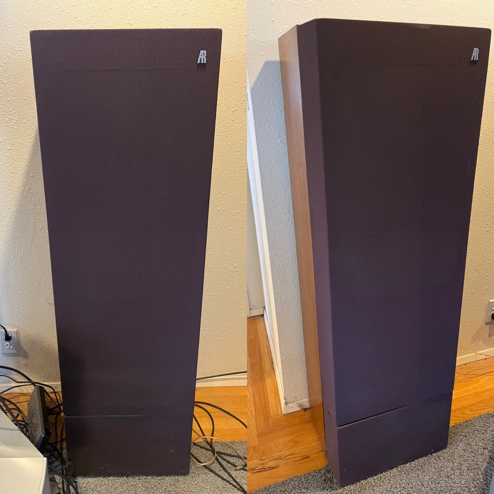 Acoustic Research AR9LS Speakers-Walnut Specs from the owner's manual: AR9LS: Floor standing columnar acoustic suspension 4 way with five drive units in a vertical array, two of which are closely spaced on a single magnet structure for uniform vertical dispersion 12" forward firing acousitc suspension woofer 10" down firing acoustic suspension woofer loaded by Bass Contour Chamber 8" acoustic suspension lower-midrange driver in its own sub-enclosure 1.5" dome upper-midrange driver .75" dome highrange driver Voltage Sensitivity: 2.83 volts produces 90dB SPL a 1 meter on axis Efficiency: 1 watt produces 87dB SPL at 1 meter on axis System Frequency Response: -3dB (half power) points at 28Hz and 32,000Hz Impedance: 4 Ohms nominal (3.2 Ohms minimum) Crossover Frequencies: 200Hz, 1100Hz, 5500Hz Dimensions:51-1/8"H X 18-1/2"W X 14-11/32"D Weight: 120lbs ea