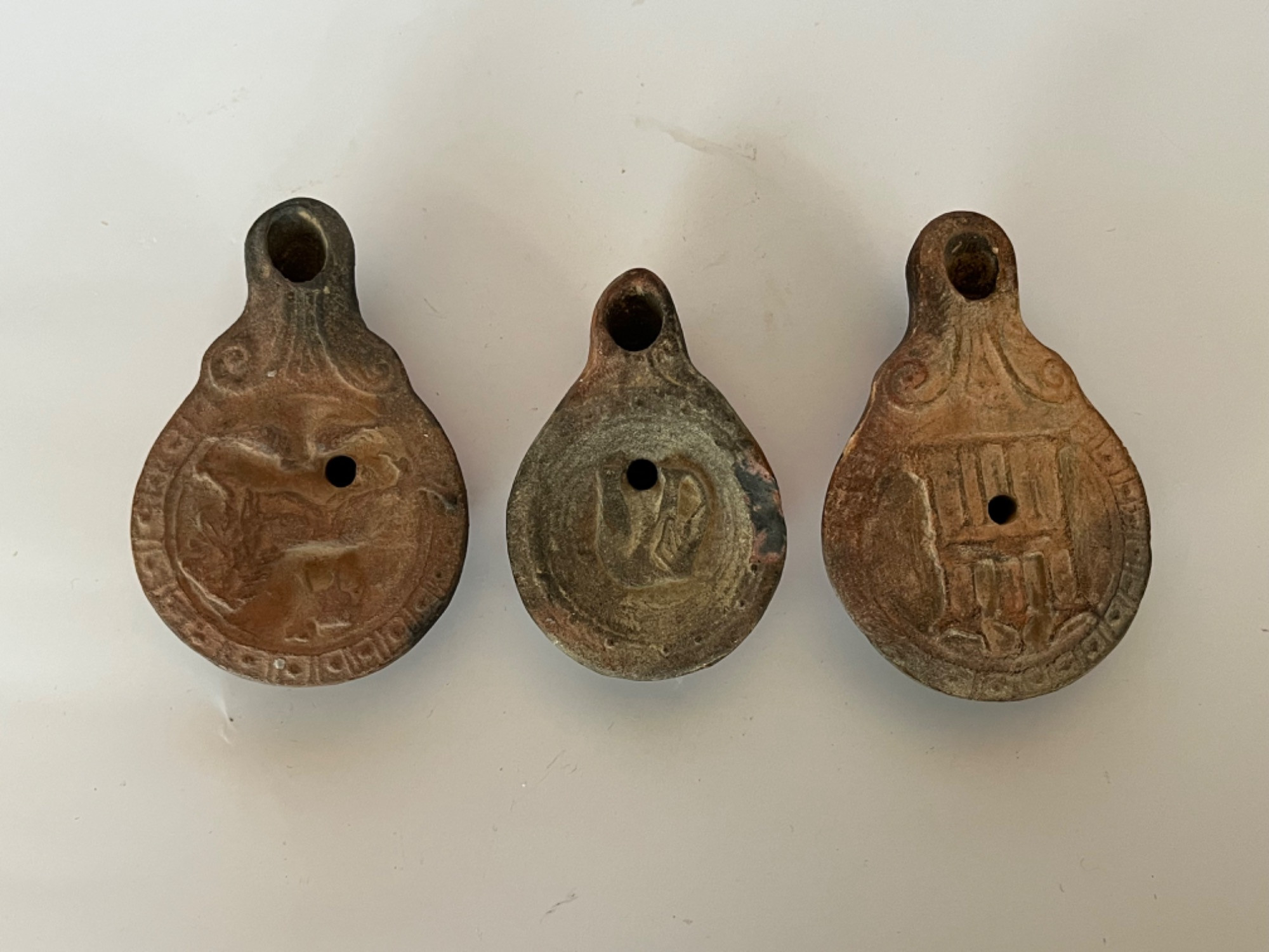 Three Roman Terra Cotta Oil Lamps Measures 3-3.5” wide Antique items offered for auction on the Site are sold “as is”. We endeavor to describe and display the items accurately and truthfully; however, we cannot guarantee the accuracy or reliability of any item’s description or condition. We strongly encourage all bidders to review images, descriptions, and condition reports and to contact us for additional information prior to bidding.