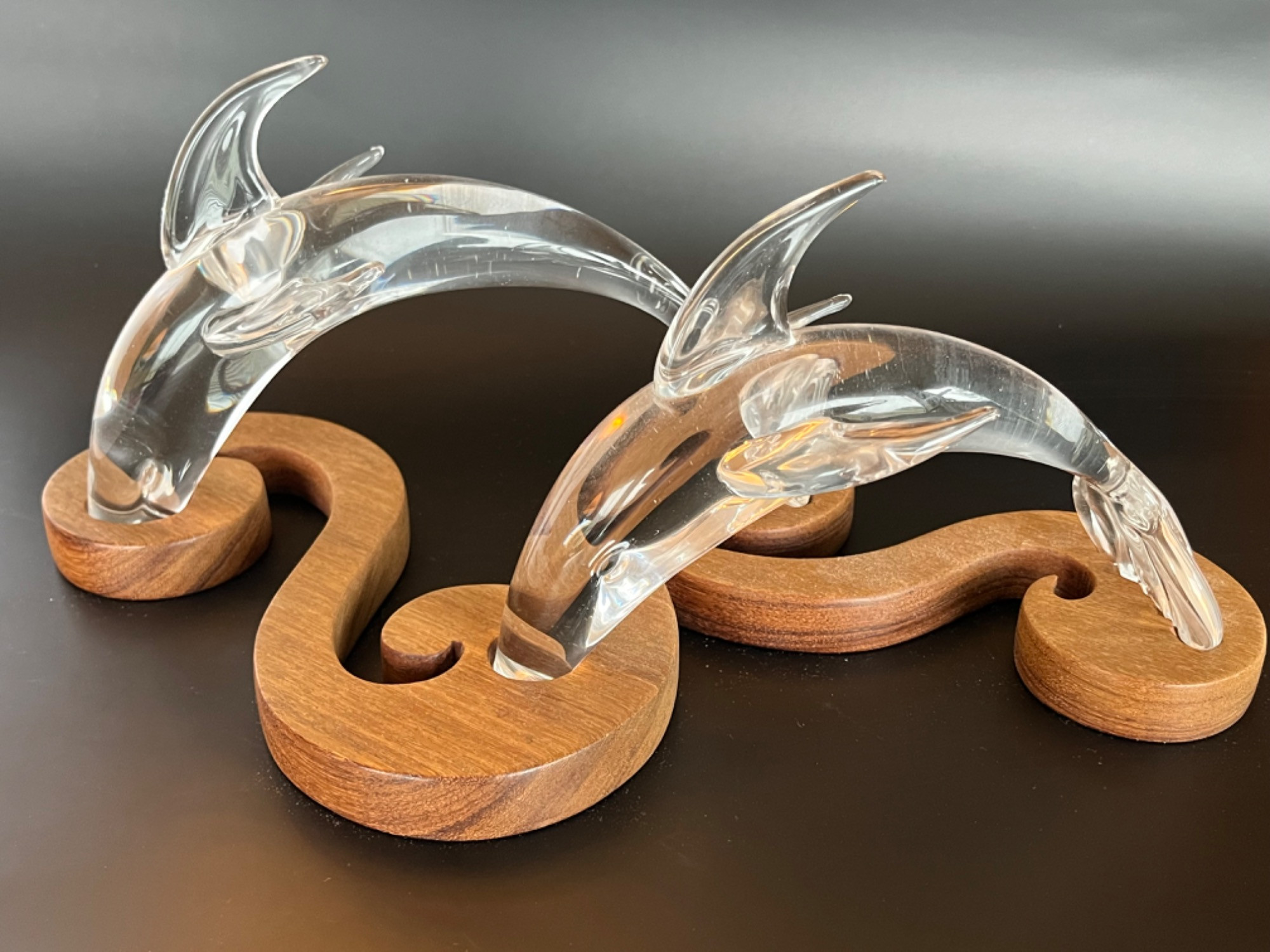 Lot # 81 - Hand Blown Glass Dolphins on Wave Like Wood Display
