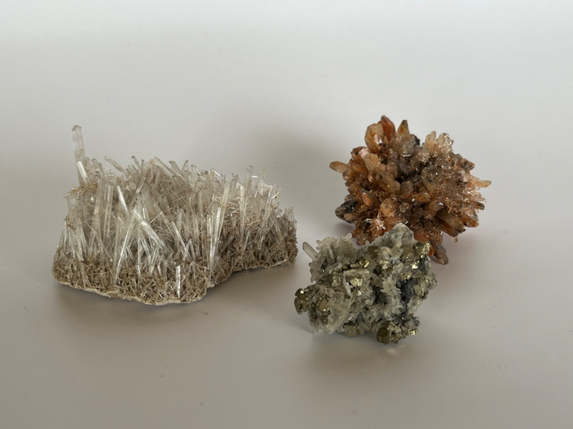 Three Crystals- Gypsum, Aragonite and Quartz With Pyrite Measures 1.5-2.75” wide