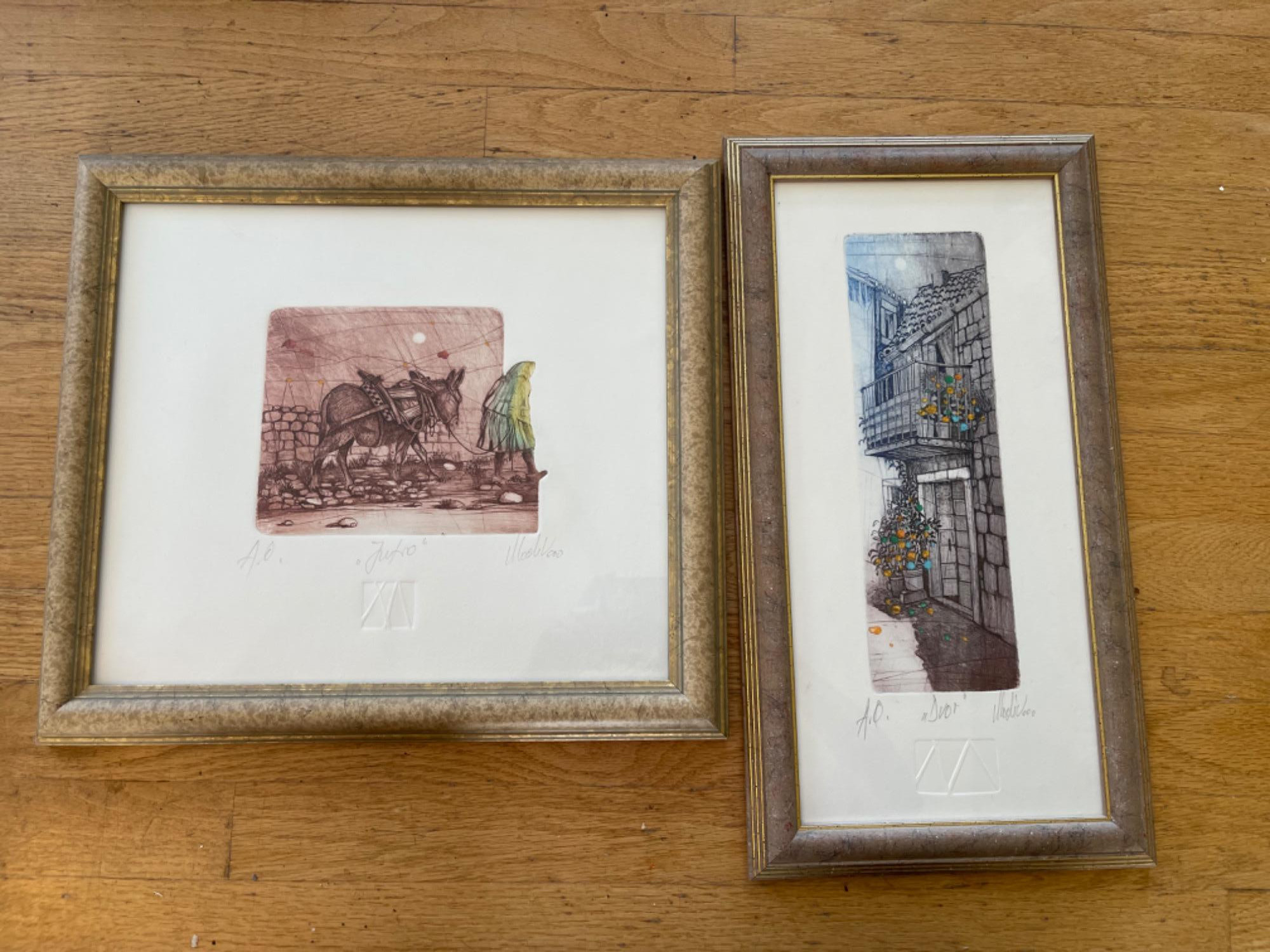 Two Signed Art Pieces. Donkey Print-16 x 14 Building- 18 T x 10W