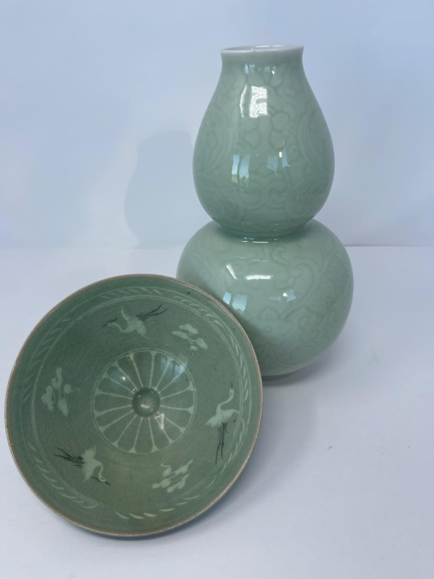 Lot # 162 - Celadon Korean Tea Bowl and Chinese Double Gourd Vase
