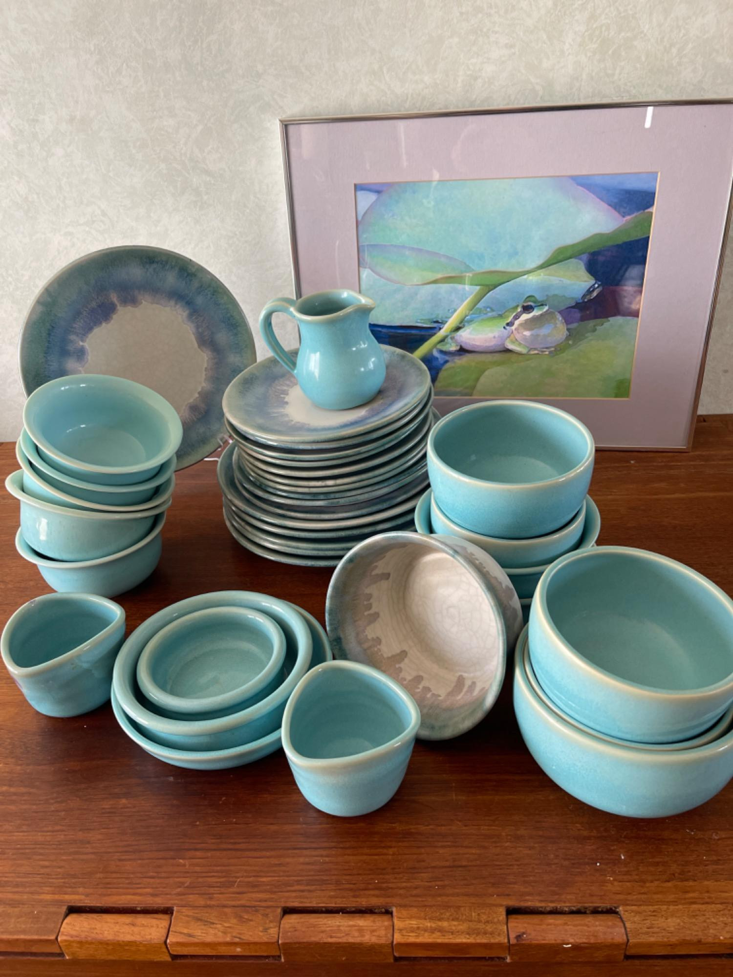 Arcanum Ranch Pottery Dishes and Doug Zimmerman Frog Watercolor. Some plates have heavy crazing. Doug Zimmerman Frog Watercolor "Serenade