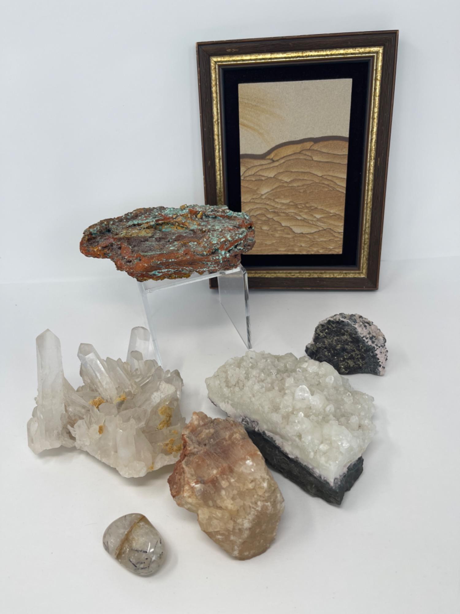 Goldstone Framed and Array Of Crystals and Rocks 6"-4"