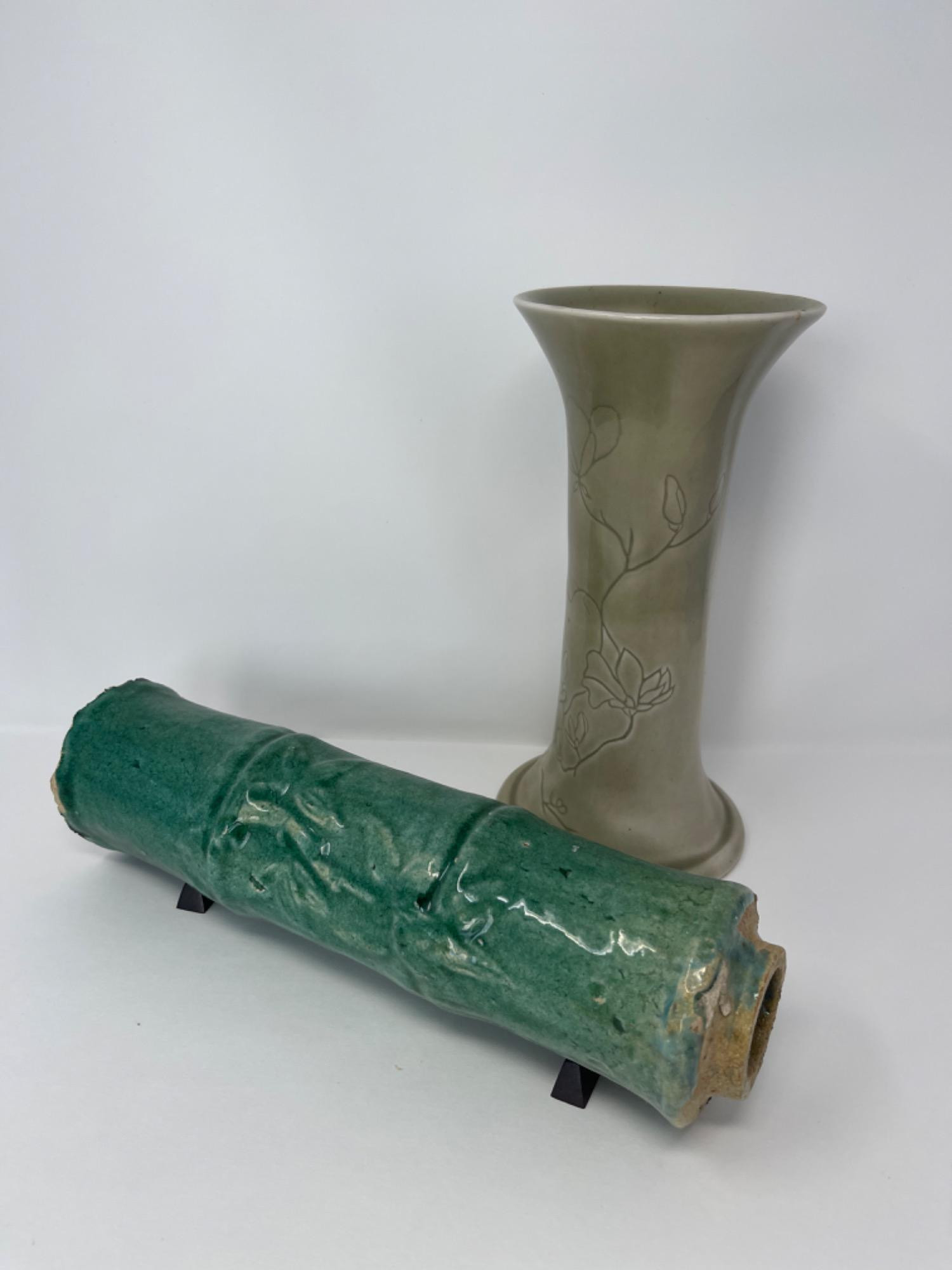 Lot # 185 - Antique Chinese Glazed Pottery Water Pipe & Arcanum Pottery Vase