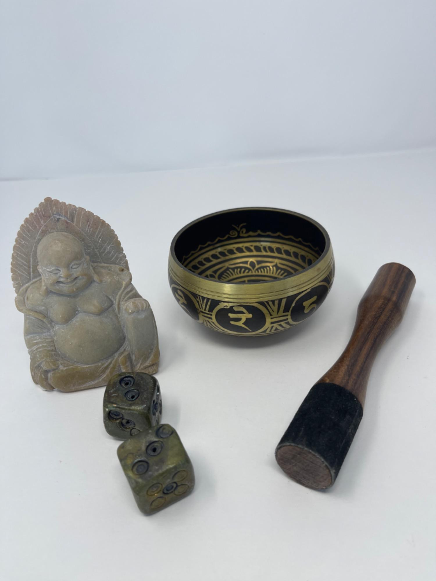 Singing Bowl/Mallet, Soap Stone Buddha and Clay Dice. singing bowl is 2'" x 4". Buddha is 4" x 2".