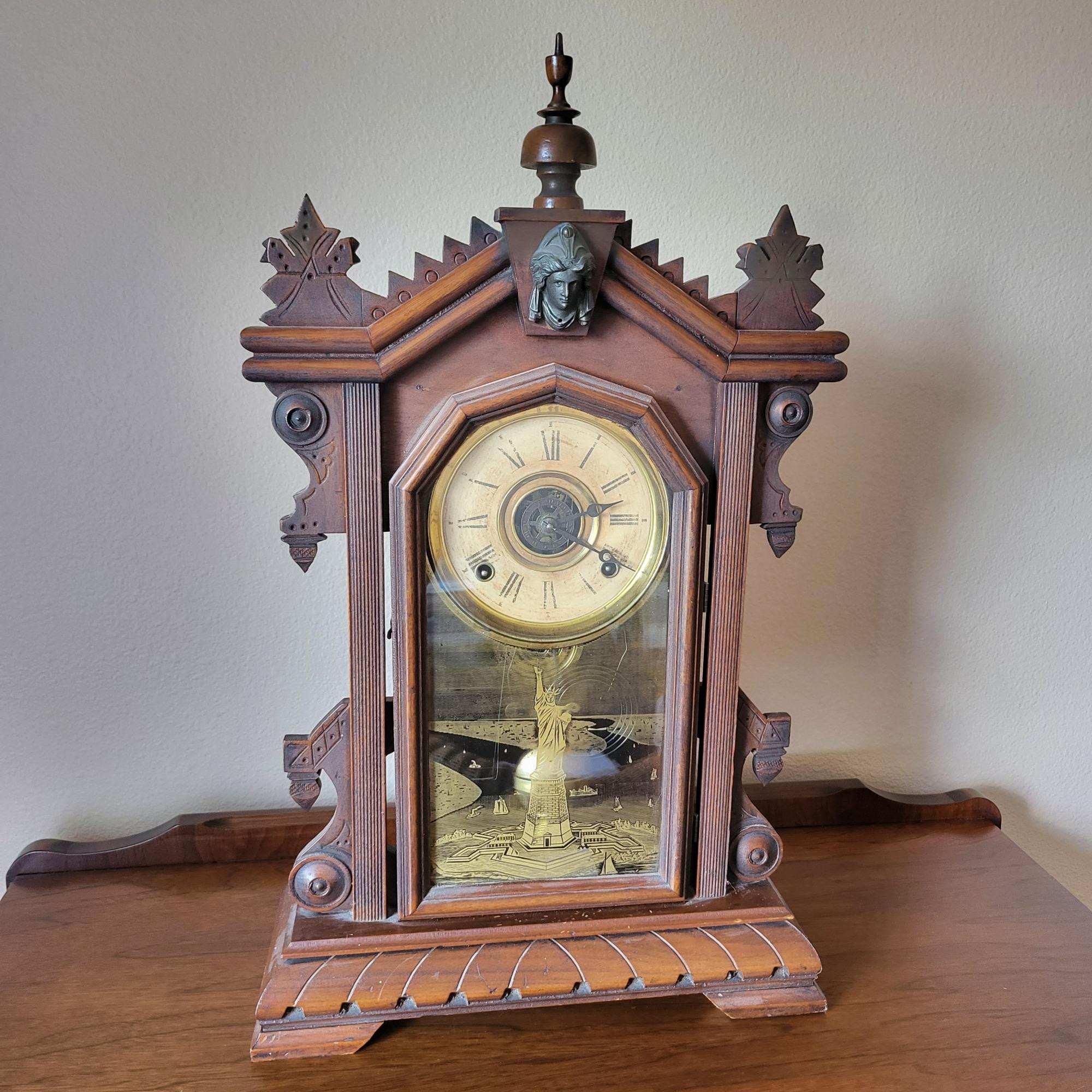 Ingraham 8 day mantel clock in running and striking condition. These clocks were made in the mid to late 1800's. Includes the key to wind the clock. Clock face is 5" round and shows aging. All wood case with carved detailing. Etched detailing on glass of statue of liberty. Excellent antique collectible.