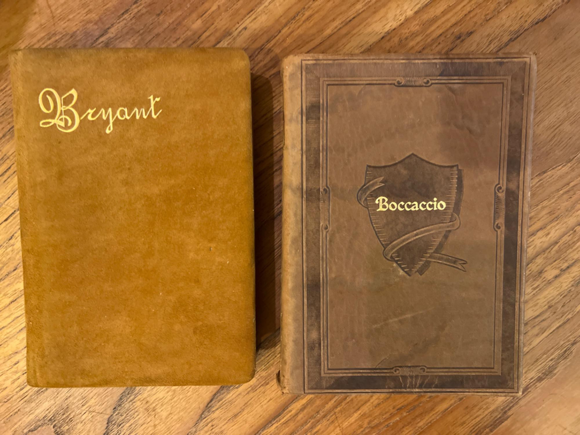 First printing 1983 of Poems of William Cullen Bryant published by Thomas Crowell Co. Cover is a soft leather/suede. Embossed in gold lettering on cover "Bryant". The Decameron by Giovanni Boccaccio has no publisher date. Printed in the United States. The work was translated by John Payne. Fine leather cover. When comparing to other printed editions it appears this is an early version of the book and may be dated late 1800's, early 1900's?