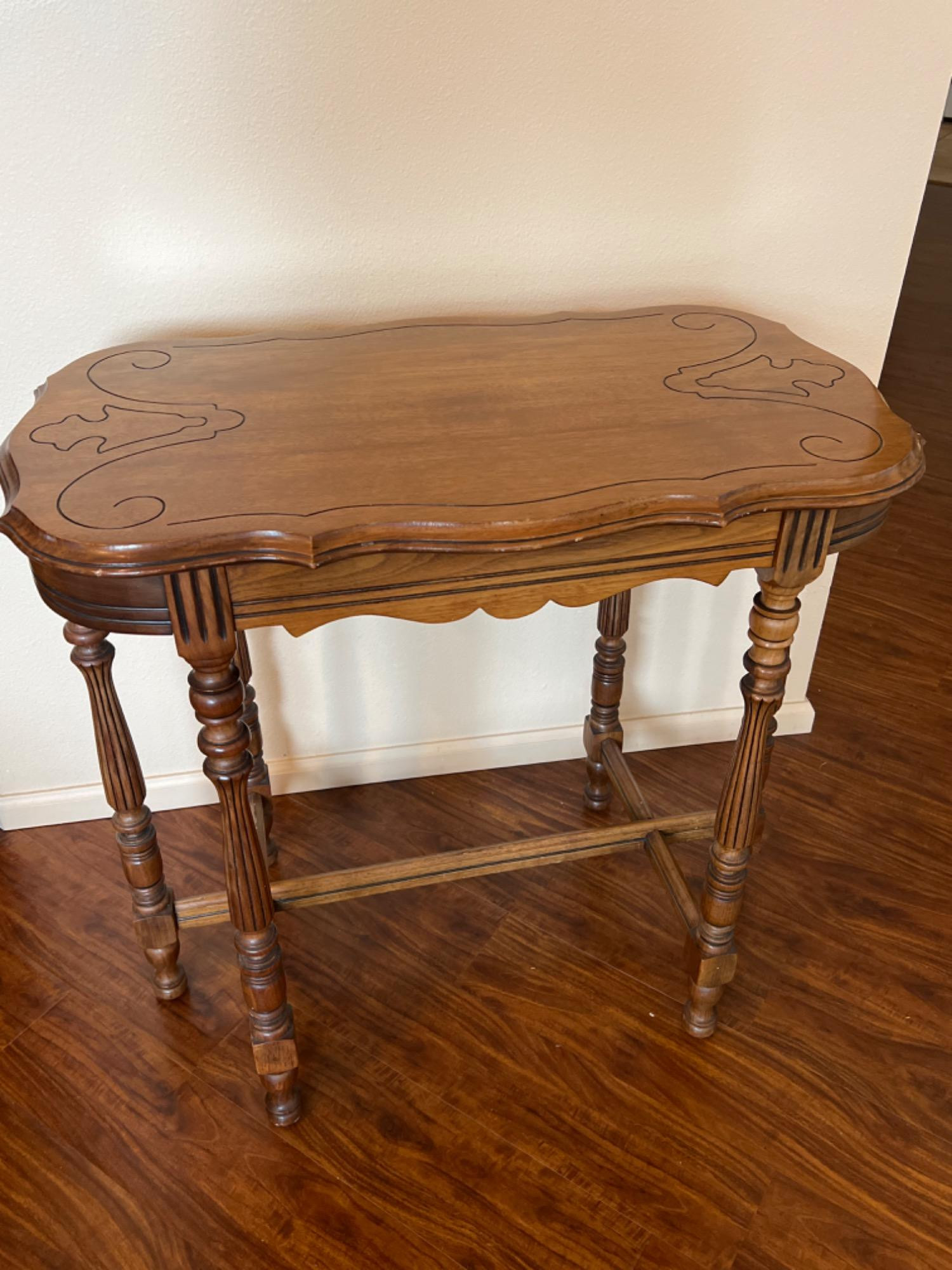 This accent table is in the Jacobean style with its turned carved legs and six legs with supports, as well as the scrolled design on top of the table. It is the perfect size and shape for a hallway accent table. We are dating this between 1930’s to 1970’s based on the generational decades that this piece was handed down to the owner.