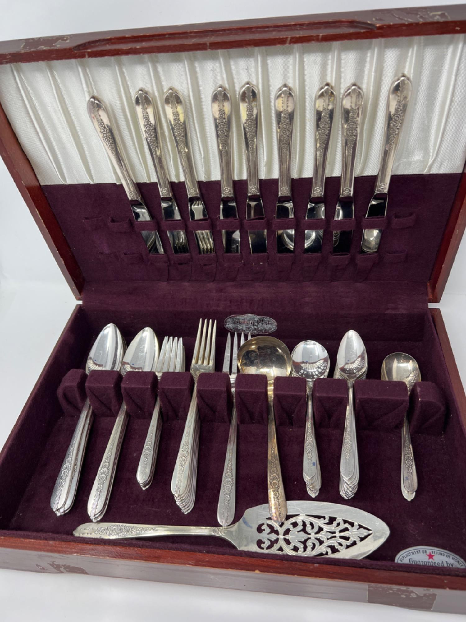 Nobility plate flatware from Grandma Mac. Royal Rose pattern. Includes tarnish proof box. At least 8 place setting along with serving pieces.