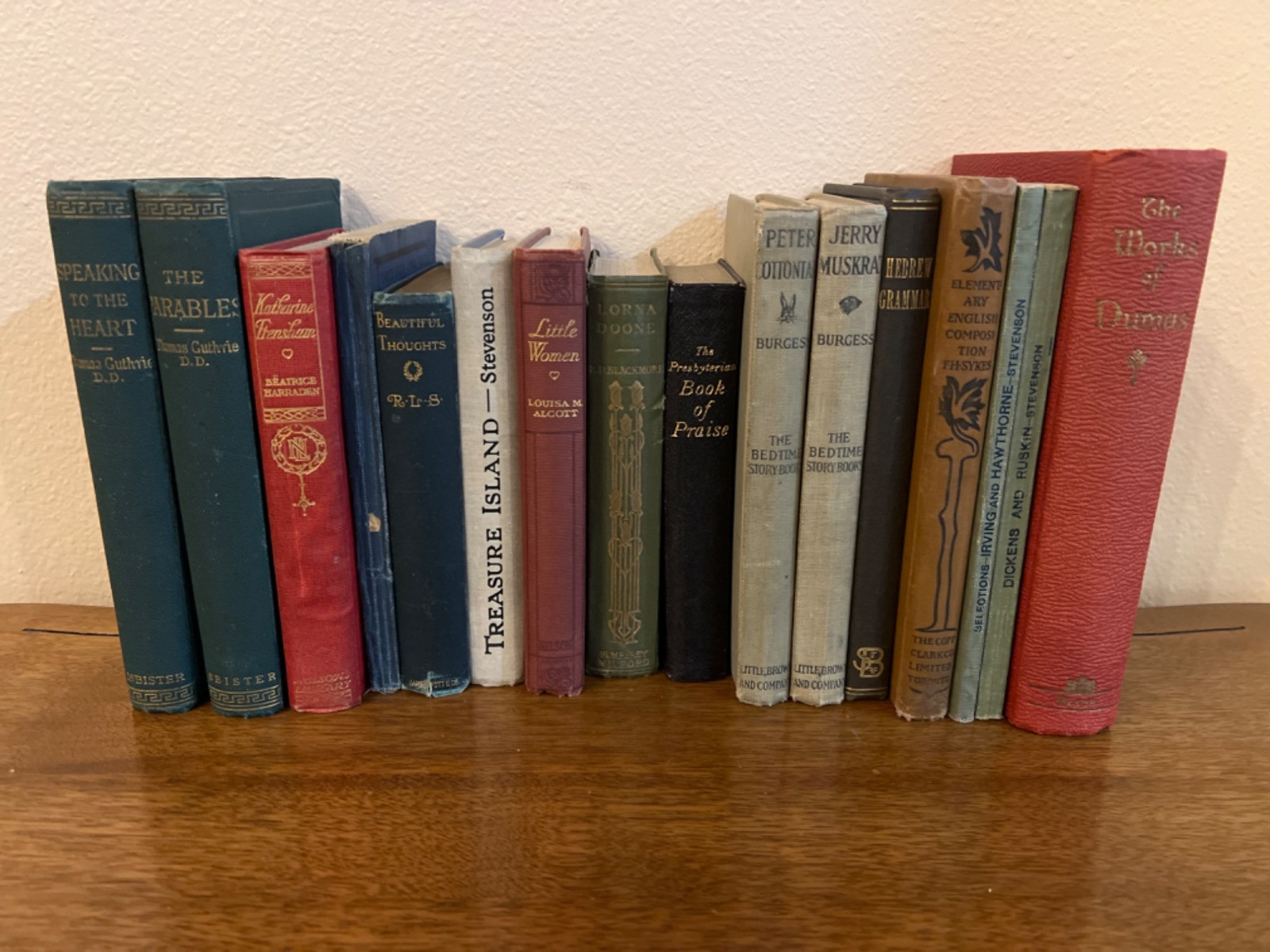 Classic titles such as Treasure Island, Little Women; Lorna Doone; Adventures of Peter Cottontail; Adventures of Jerry Muskrat; Works of Dumas and more. Dates are late 1800s and early 1900s.