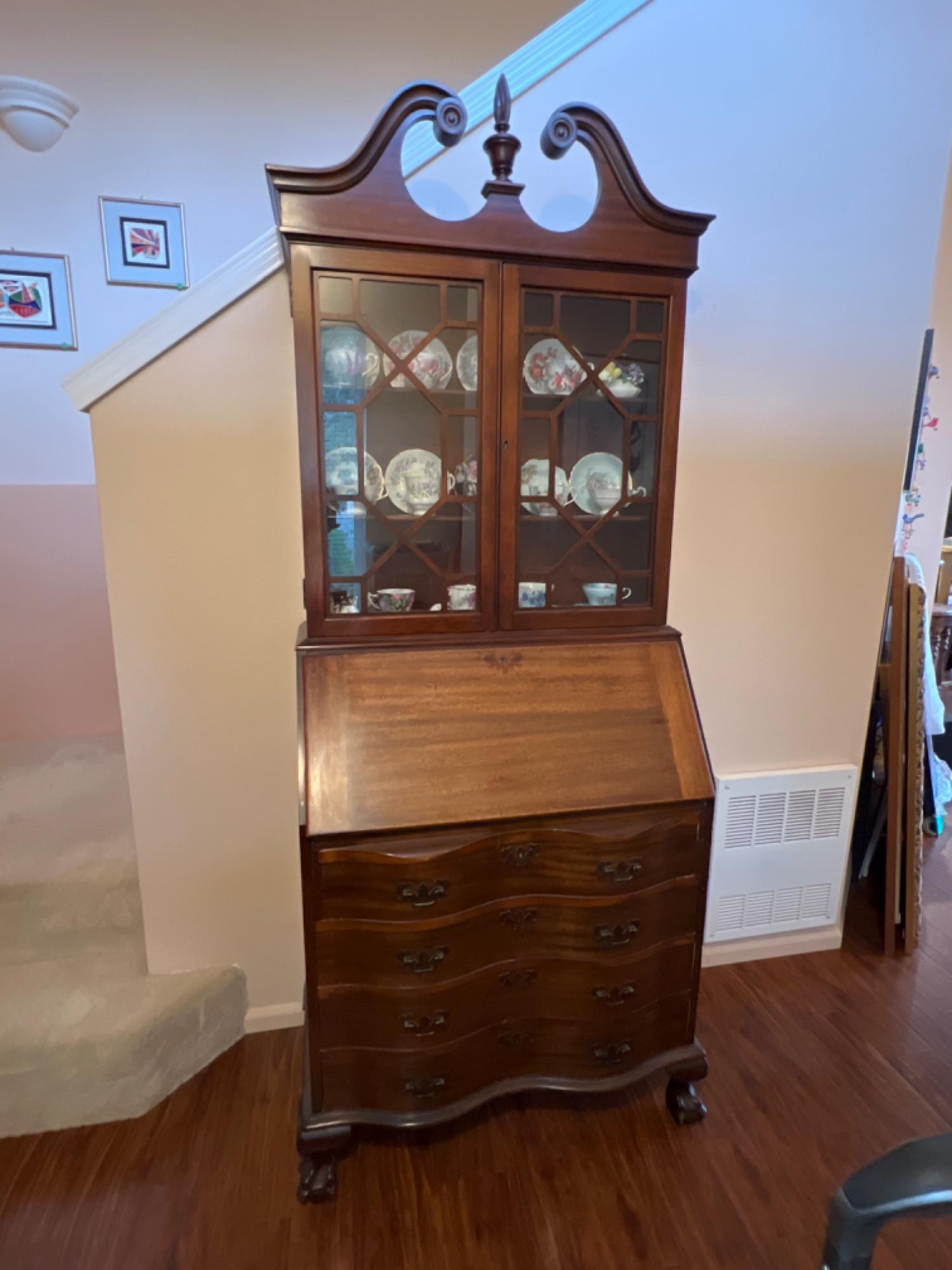 Antique Secretary Desk with Bookcase Top or Collectible Display. A gorgeous Chippendale serpentine front one piece secretary desk. Made from walnut or mahogany. Interior opens to four drawers, pigeon holes and hidden compartments. Upper bookcase portion shows an open scrolled pediment with turned finial. Doors are glass with fretwork. There are 2 interior bookcase shelves. Hardware is made of brass in classic Chippendale fashion, circa 1920s. (Note that the ornate brass cover at the key hole needs to be repaired.) The chest stands on two ball and claw front feet and two square back feet. Classic styling, very heavy and well made. DOES NOT INCLUDED items on shelves. Bidding on this lot is an agreement that: (1.) You will have 2 capable, able-bodied persons to lift and load at a minimum. (2.) You