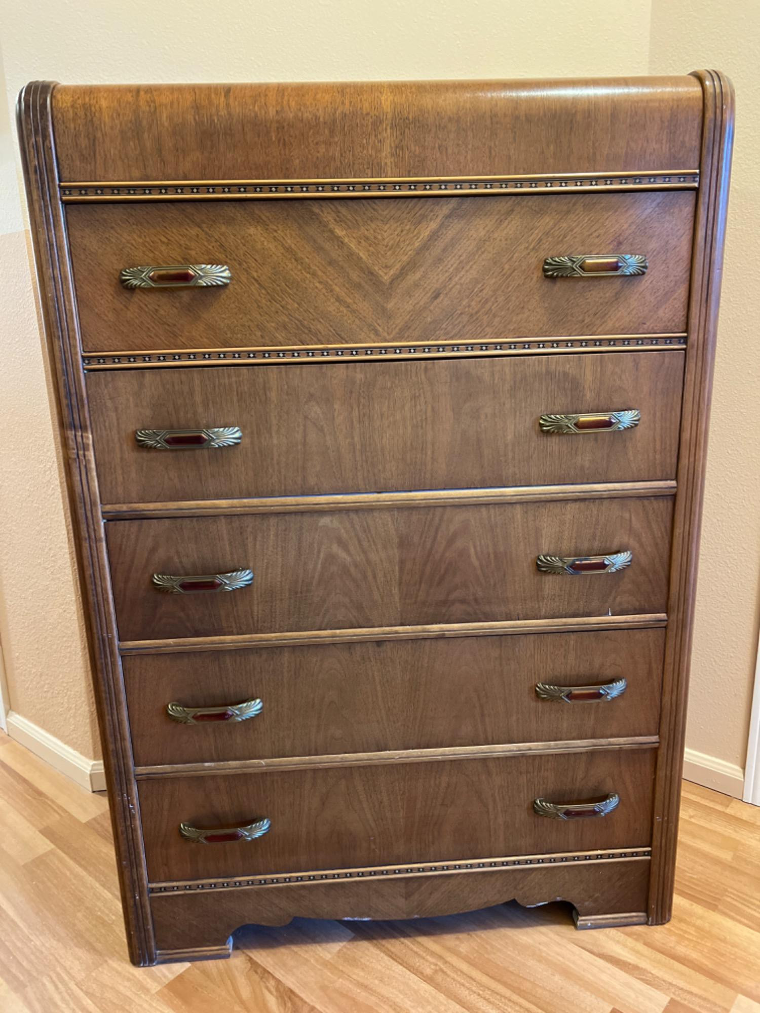 Armon Furniture waterfall art deco style five drawer dresser. Original drawer pulls. Solid wood. Located on 2nd floor where steps are required for removal. Bidding on this lot is an agreement that: (1.) You will have 2 capable, able-bodied persons to lift and load at a minimum. (2.) You