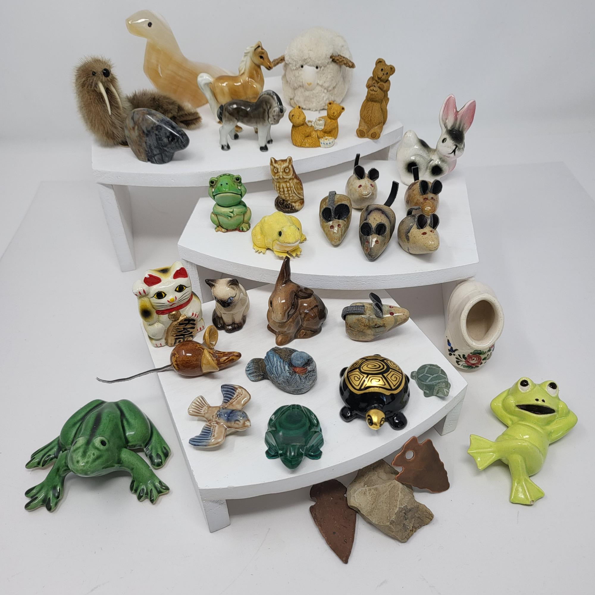 Large collection of stone, clay, ceramic, resin, fur miniature figures: horses, rabbits, frogs, bears, cats, mice & more. 1/2 inch to 2-3 inch in size.