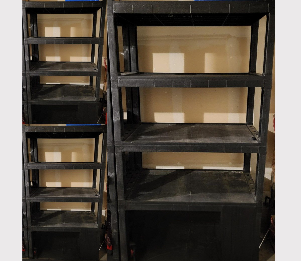 Three sturdy black plastic storage shelving. Each one has five shelves. Easy set up and tear down, ideal for organizing and storage in garage or utility room.