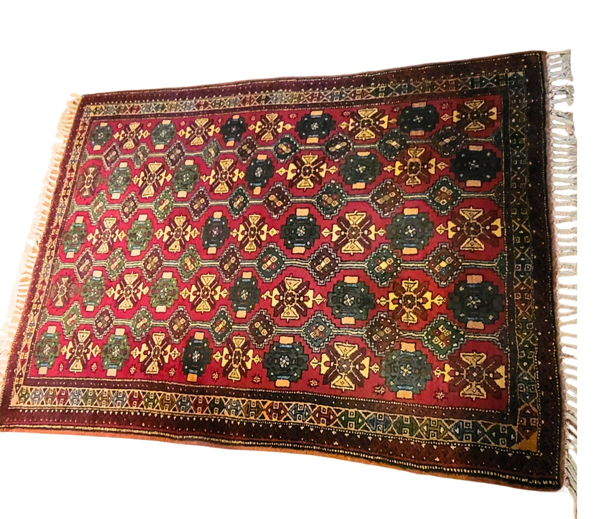Antique woven wool rug 83" x 62". Braided tassels on both ends. Soft and durable rug was acquired in Turkey. Exquisite multi-colored medallions and a detailed geometric border on rich red background. Excellently handcrafted.