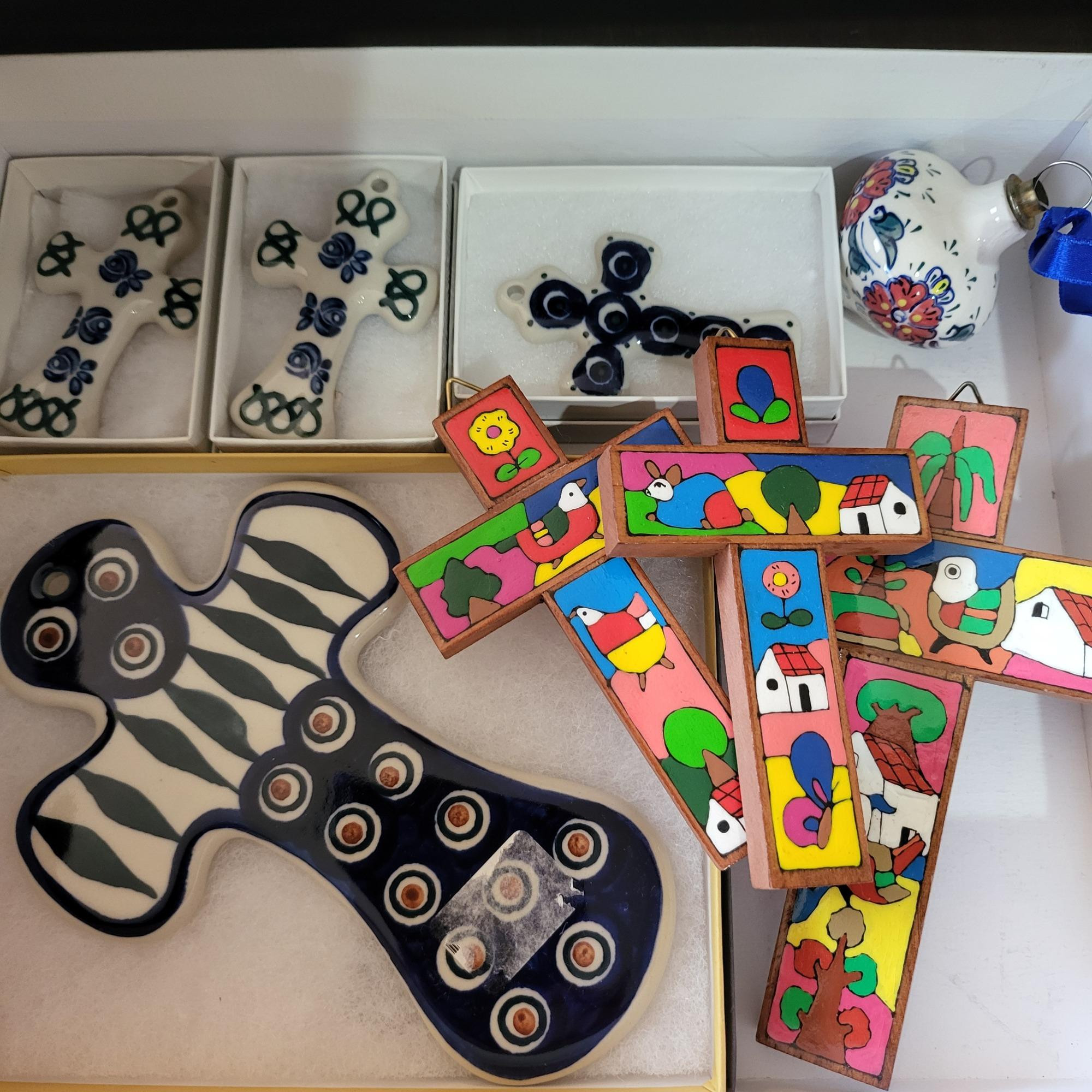 Polish pottery and hand crafted wood decor - several porcelain crosses, a hand painted wood picture frame, and porcelain ornament.