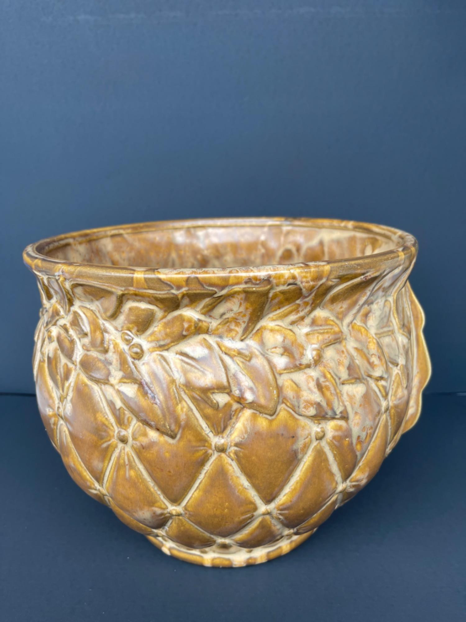 Vintage McCoy Pottery Jardiniere Tufted Leaves Planter Item: A vintage McCoy Pottery jardiniere featuring a tufted leaves design. Takeaways: Decorative Planter: Embossed leaf pattern adds texture and visual interest. Materials: Made of ceramic with a distinctive glaze in earthy tones. Collectible: McCoy Pottery is known for its unique designs and quality craftsmanship. History: McCoy Pottery, established in the early 20th century, became renowned for its decorative and functional ceramic pieces, making this jardiniere a valuable collectible. Dimensions: 9" T x 10" W