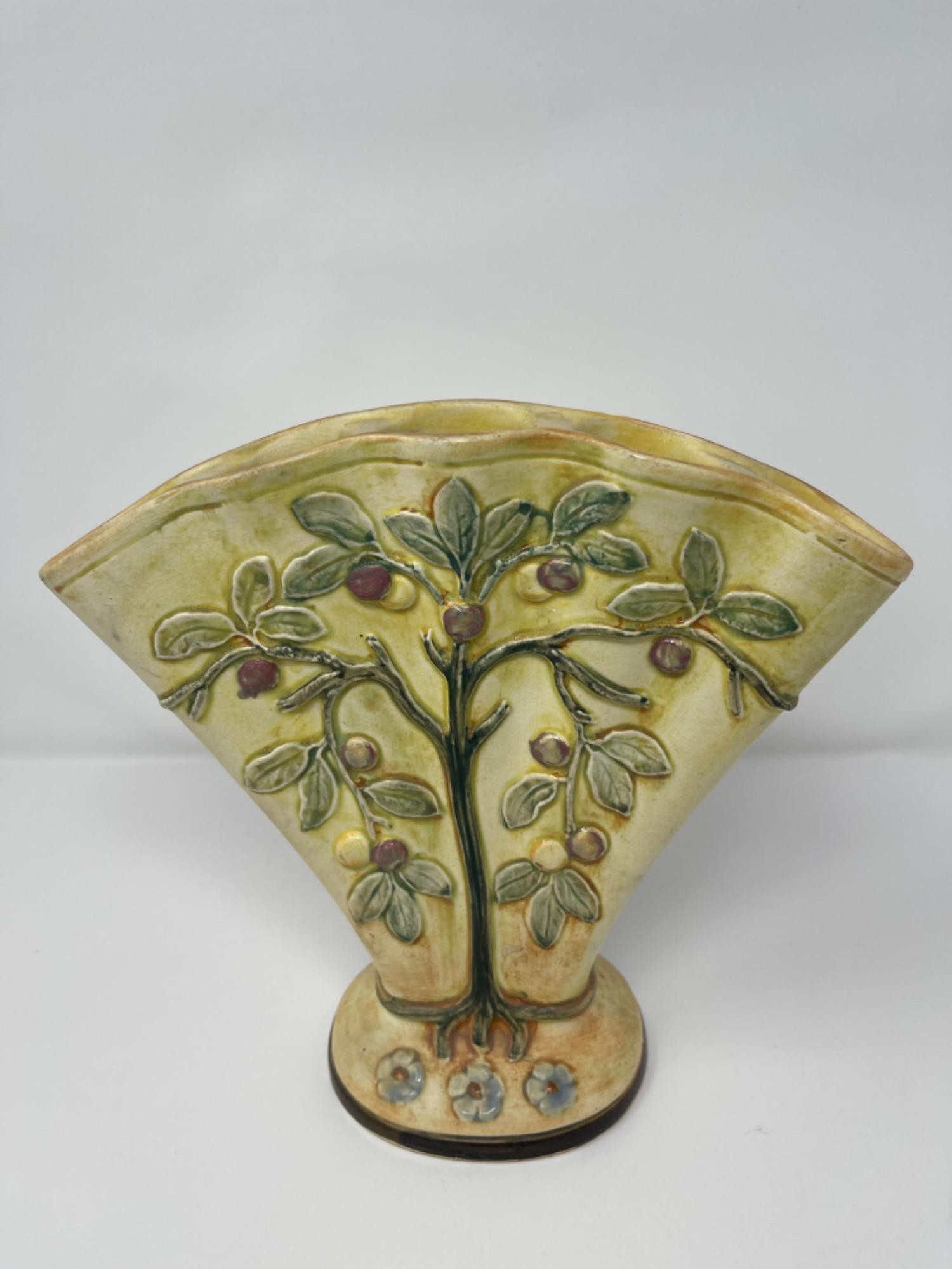 This is an antique Weller art pottery vase, featuring a fan shape with raised floral motifs. Item: Weller art pottery vase Dimensions: Approximately 8 inches tall, 10 inches wide Design: Fan shape with raised floral design of leaves and berries Material: Ceramic with a glazed finish Weller Pottery, founded by Samuel Weller in Ohio in 1872, became one of the largest and most influential American potteries by the early 1900s. This vase, with its distinctive design and craftsmanship, reflects the artistic trends and high-quality production of Weller Pottery during that era.