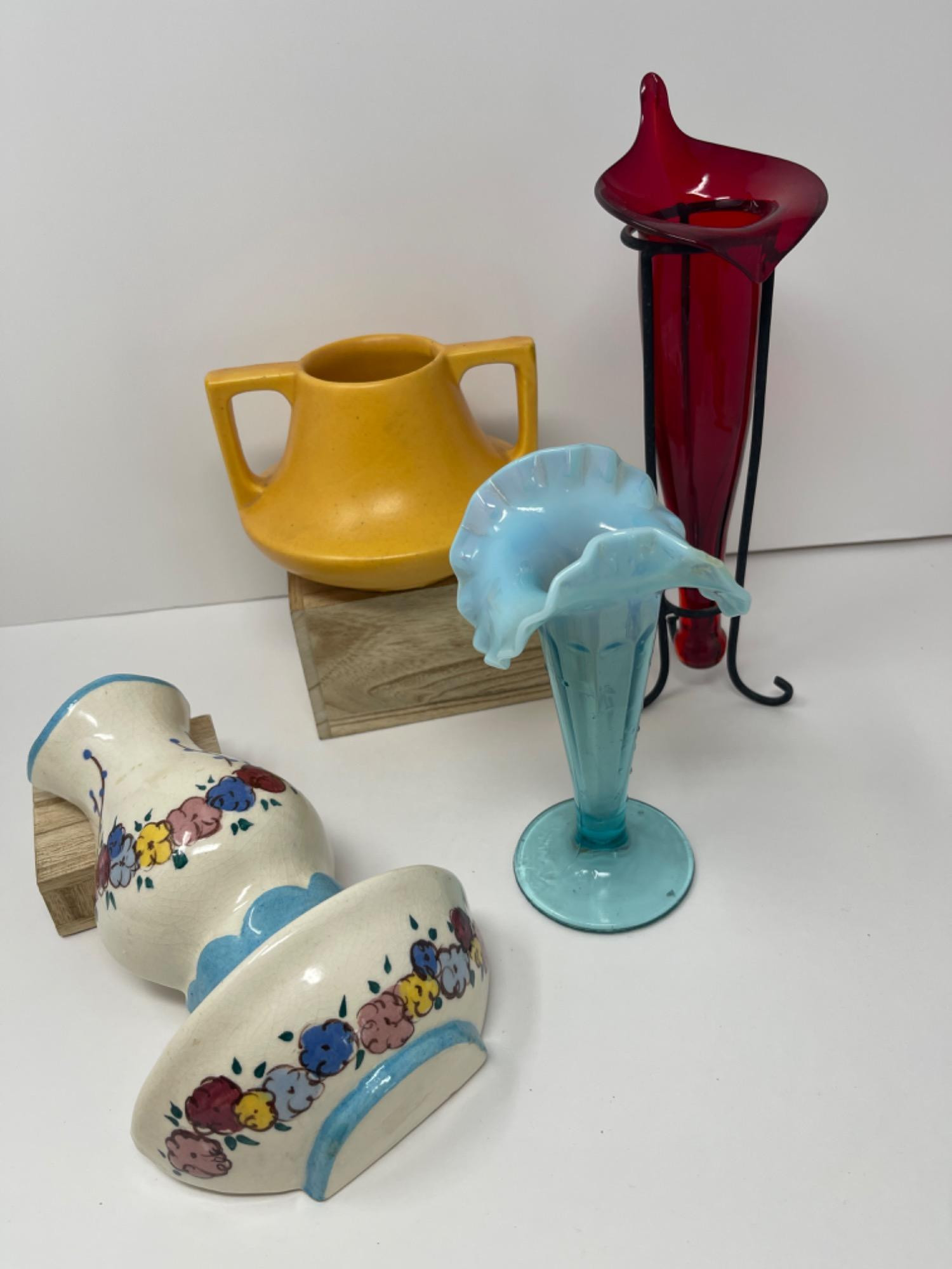 Item/s: A collection of five ceramic pieces including a yellow pitcher, one off-white teapot with floral designs, and two vases (one tall red, one shorter blue). Takeaways: Materials: Glazed ceramic with various finishes (matte to high gloss). Styles: Vintage, likely mid-20th century. Uses: Decorative, collectible items. History: These items are typical of mid-20th century decorative ceramics, often used to add aesthetic value to homes. The varied designs and finishes reflect the eclectic tastes of the era. Measurements: Red Vase 11” wall pocket-8”