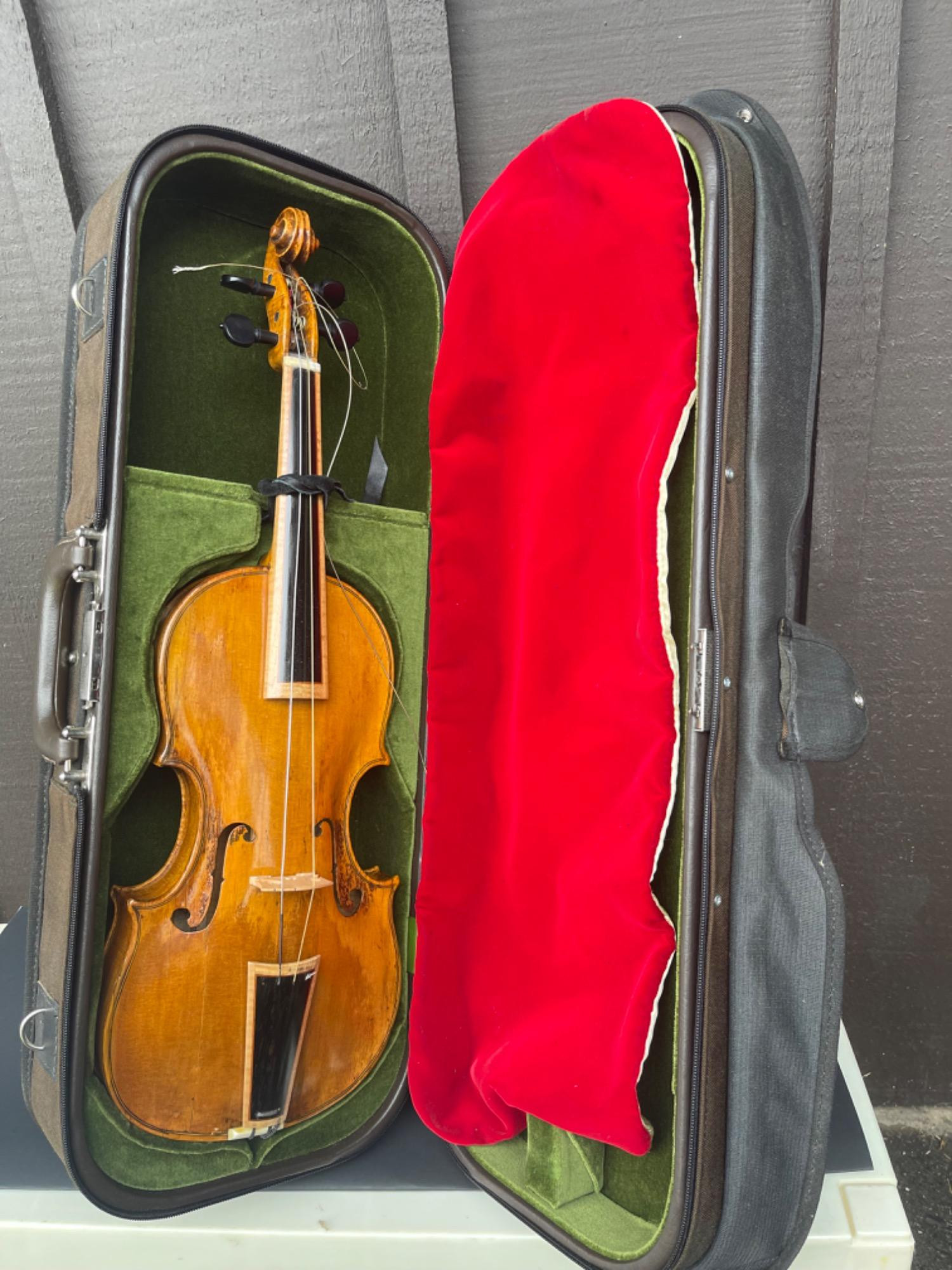 This is a Baroque violin, a stringed musical instrument with a protective case. Slightly different than the modern violins. There are some companies that wanted to recreate the sound of music from several hundred years ago, this is a older style recreation to play like the older violins. Case: American Case Company (Since 1900) The violin is crafted from wood, which is essential for its resonant sound quality. The violin has a rich history dating back to the 16th century in Italy. Renowned makers like Stradivari and Guarneri have significantly influenced its design and construction, making it a beloved instrument in classical and contemporary music. This particular violin, with its classic design, reflects the enduring legacy of violin craftsmanship.