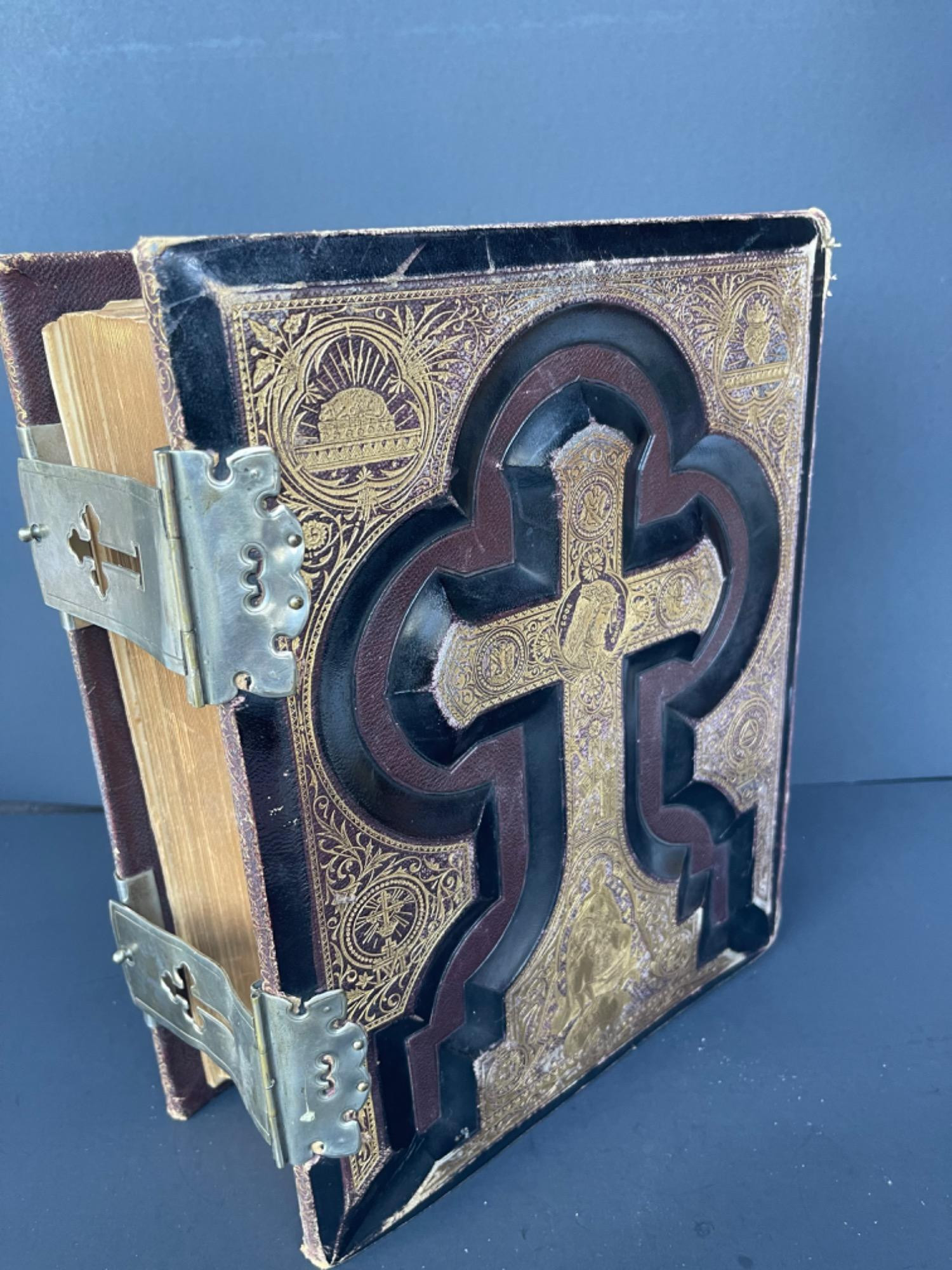 Antique Holy Catholic Bible With Clamps-Douay & Rheims 1800's. Item: An antique Catholic Bible from the 1800s, Douay-Rheims version, with metal clamps. Takeaways: Material: Likely leather-bound with metal clamps. Design: Embossed cross and ornate cover. Era: 1800s, Douay-Rheims English translation. History: The Douay-Rheims Bible is one of the earliest English translations from the Latin Vulgate, significant for its historical and religious value.