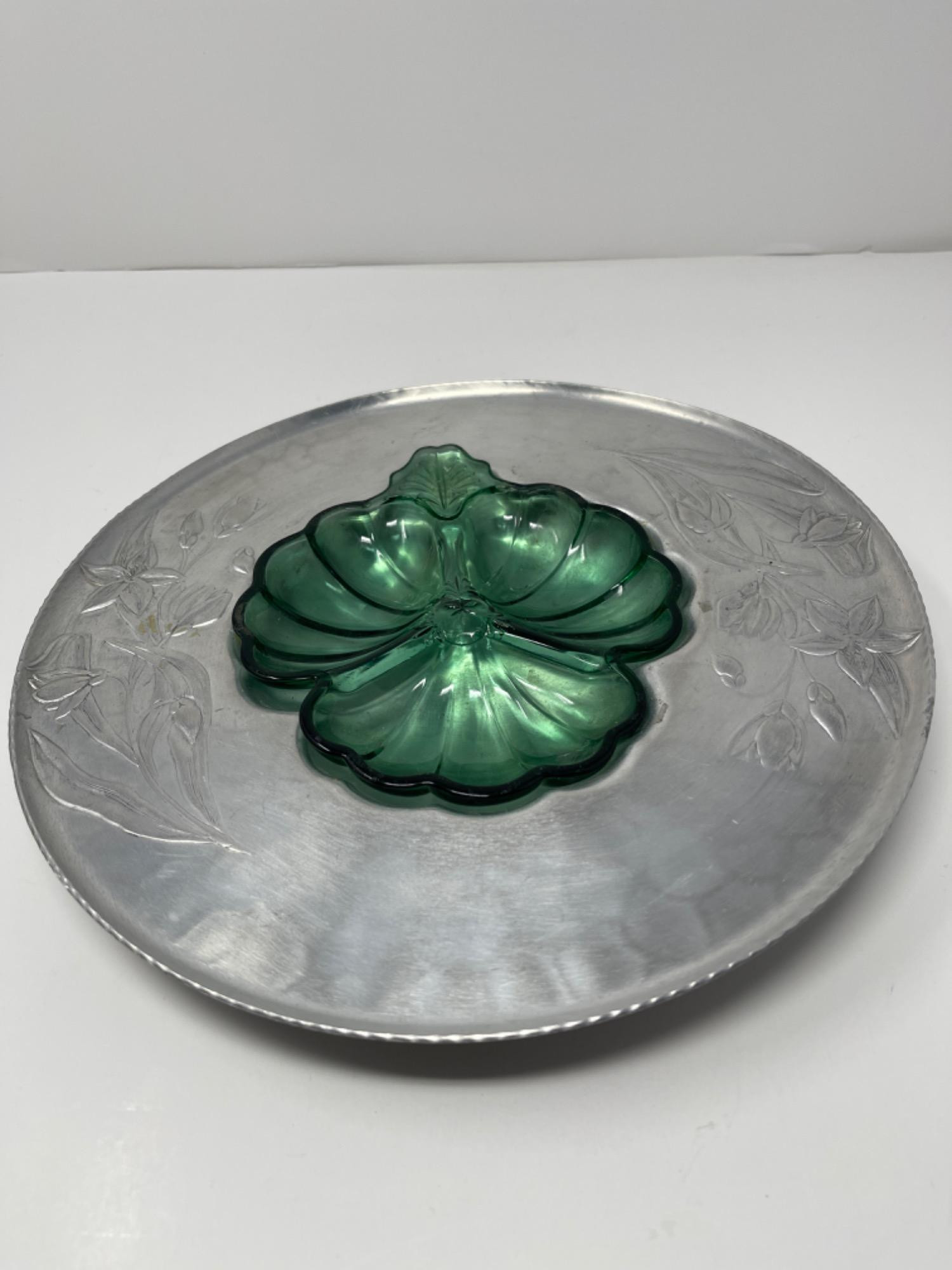 Item: A round aluminum relish dish with an embossed floral pattern and a central ultramarine glass bowl. Dual-Material Composition: Aluminum dish with a central ultramarine glass bowl. Decorative and Functional: Used for serving condiments or small appetizers. Dimensions: About 11.5 inches in diameter. History: Likely from the early to mid-20th century, combining practical metal with decorative glass elements for elegant table settings.