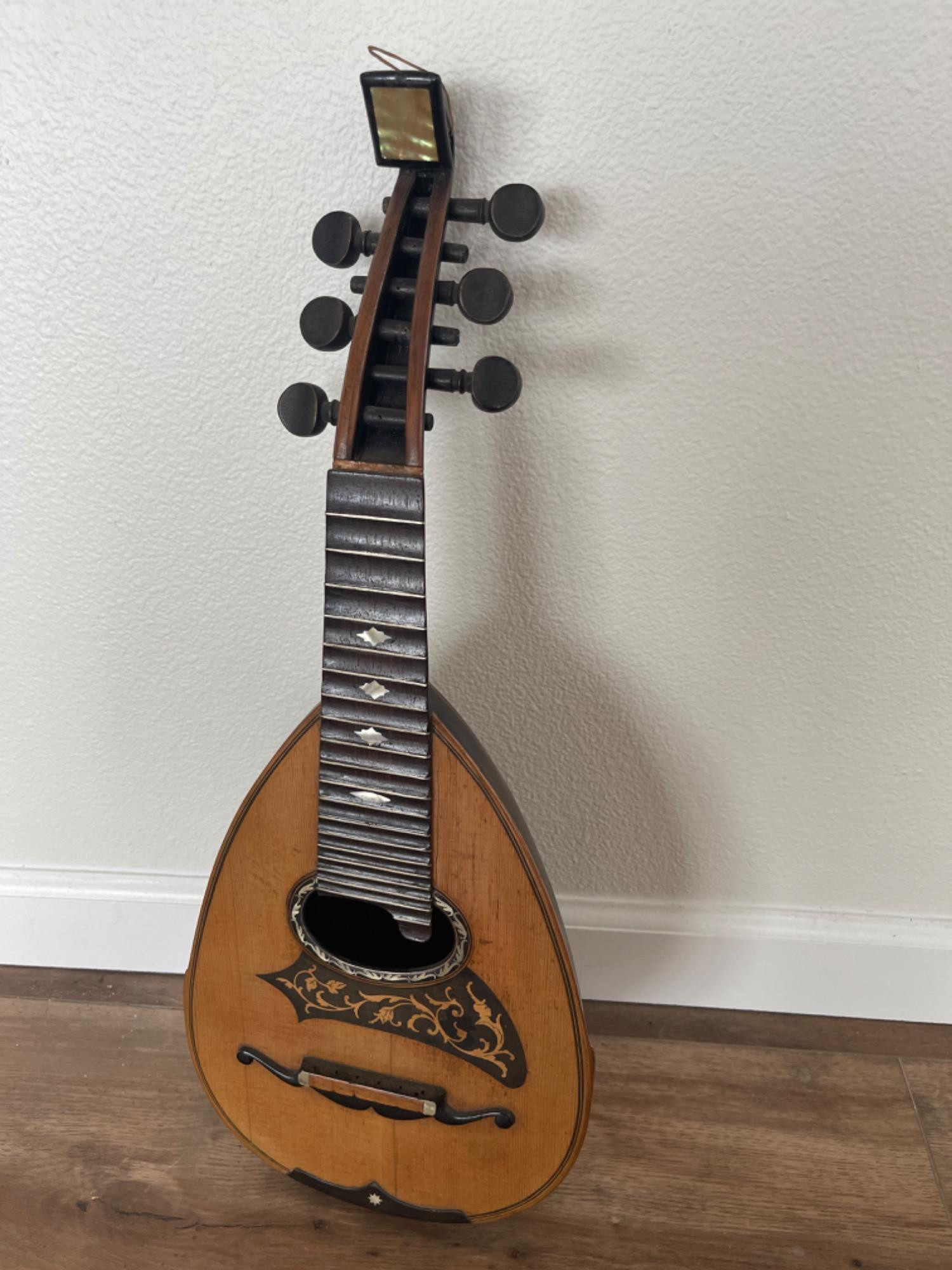 Item: A Lombard-Neapolitan mandolin crafted by Carlo Albertini e Figlio. Craftsmanship: Made by Carlo Albertini e Figlio, known for high-quality string instruments. Materials: Likely wood with decorative inlays. Design: Features typical elements of Lombard and Neapolitan mandolins. History: Carlo Albertini e Figlio specialized in traditional string instruments, particularly mandolins, during the early 20th century, reflecting the rich musical heritage of Lombardy and Naples.