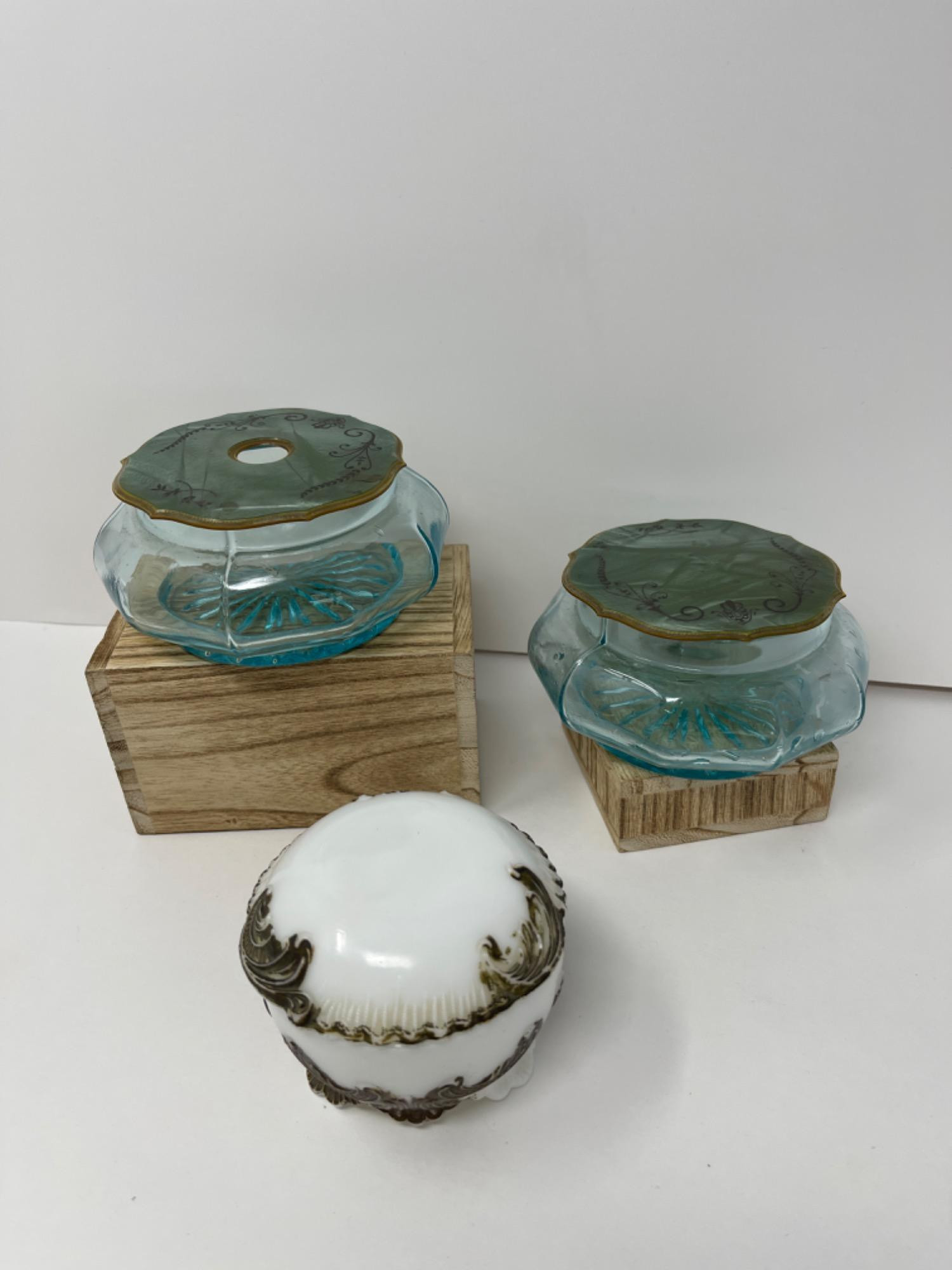 Item/s: A set of Art Deco vanity items, including a blue glass powder box and a blue glass hair receiver. Takeaways: Material: Blue glass with maybe white-green ceramic. Design: Art Deco style with elegant, geometric shapes. Era: 1920s-1930s, reflecting the luxurious and modern aesthetic of the Art Deco period. History: Art Deco was a prominent design movement known for its bold geometric patterns and lavish ornamentation, influencing various decorative arts, including vanity items. Measurement: Turquoise glass set-.4 x 2.5