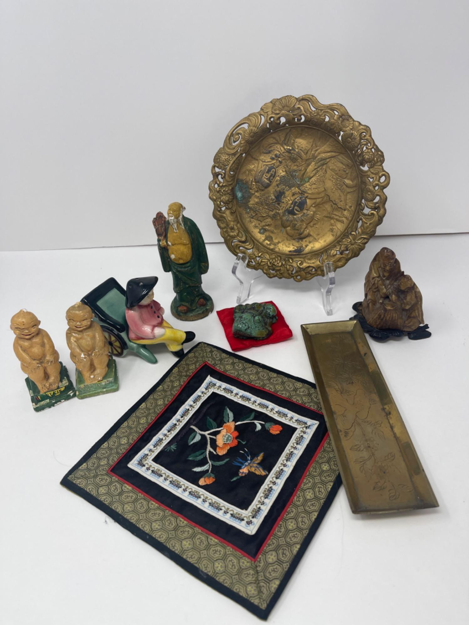 Asian Inspired : Figurines, Textile, and Hubei Turquoise Frog Item/s: A collection of vintage Asian-inspired decorative items, including figurines, a brass plate, an embroidered textile, and an engraved box. Takeaways: Diverse Collection: Includes figurines, a brass plate, an embroidered textile, and an engraved box. Materials: Made from ceramic, stone, brass, and textile. Craftsmanship: Detailed workmanship reflecting cultural and artistic traditions. History: These items likely represent various aspects of Asian cultural heritage, showcasing traditional craftsmanship and artistic expression. They may have been used for both decorative and functional purposes in their original contexts. Measurement: Brass etched plate is 7 inches in diameter frog figuring is 2 1/2 inches and all other things are approximately between 5 inches and 3 inches tall