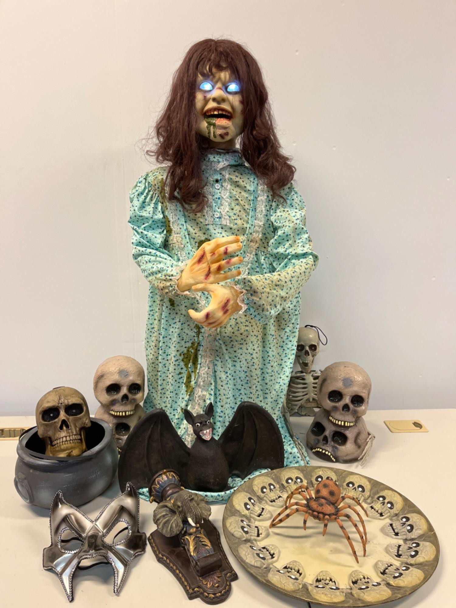 Animated Regan & Spooky Decor Batteries or AC adapter Skull platter: Dia: 15.5” Bat: 14.5”Al x 3.5”D x 8.25”H 2 Plastic stacked skulls: 6”L x 6”D x 9”H Spider: 7”W x 6”D x 3.5”H Skull: 4.5”W x 7”D x 6”H Elephant Sconce: 5”W x 4.75”D x 10.5”H Silver plastic mask: 7”W x 3.5”D x 7.5”L Plastic coldren: Dia: 8” x 5.25”H Hanging Skeleton: NOT tested