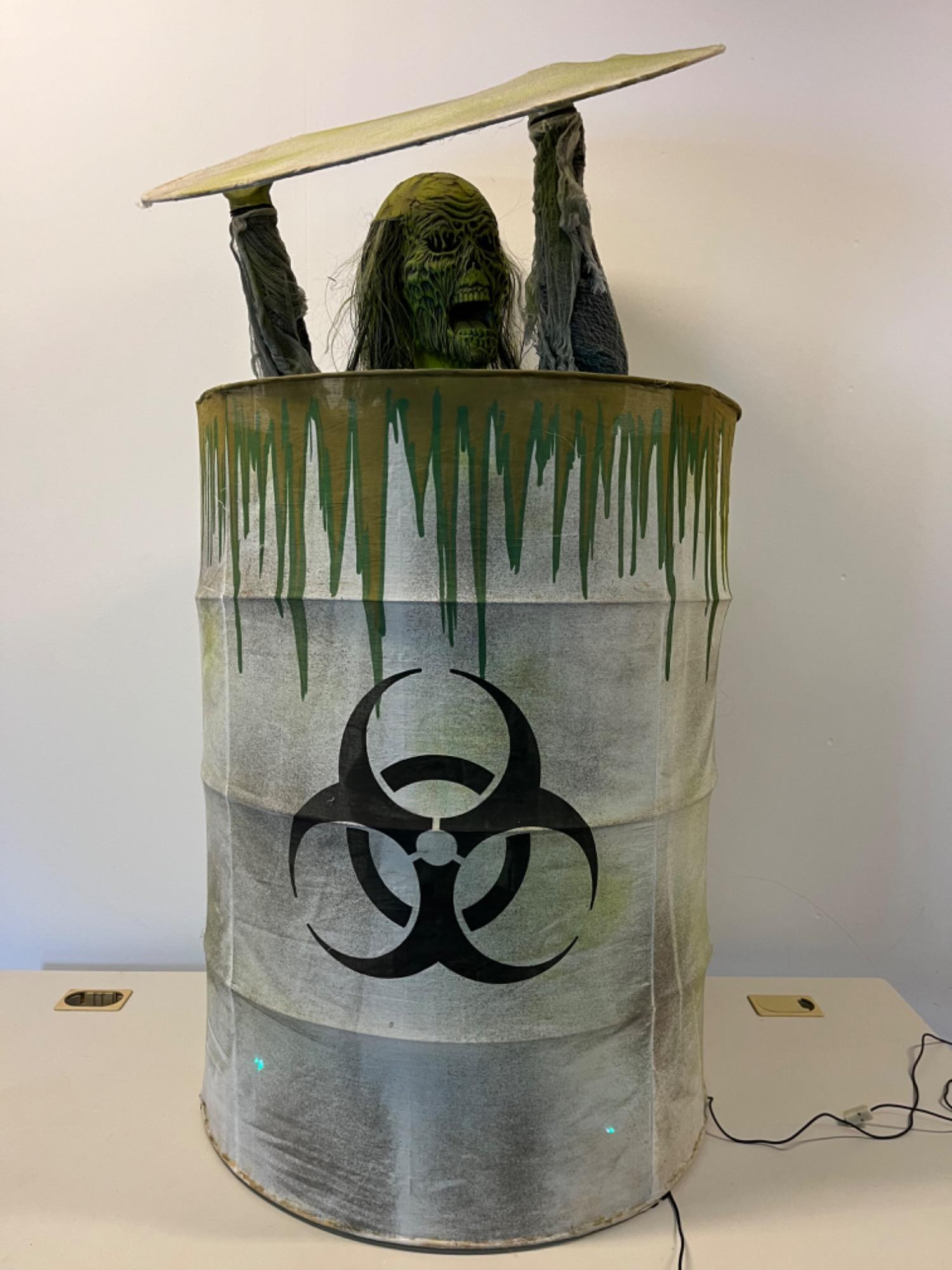 Sound Activated Toxic Zombie Requires an electrical outlet. Barrel is approx. 3’ in height before zombie raises up.