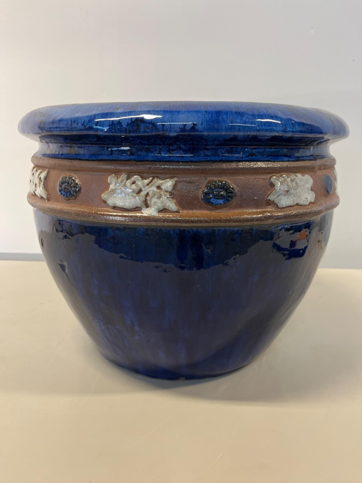 Blue & White Glazed 14” Red Clay Planter Height: 13” Top Inside Dia: 14” Bottom Dia: 11”