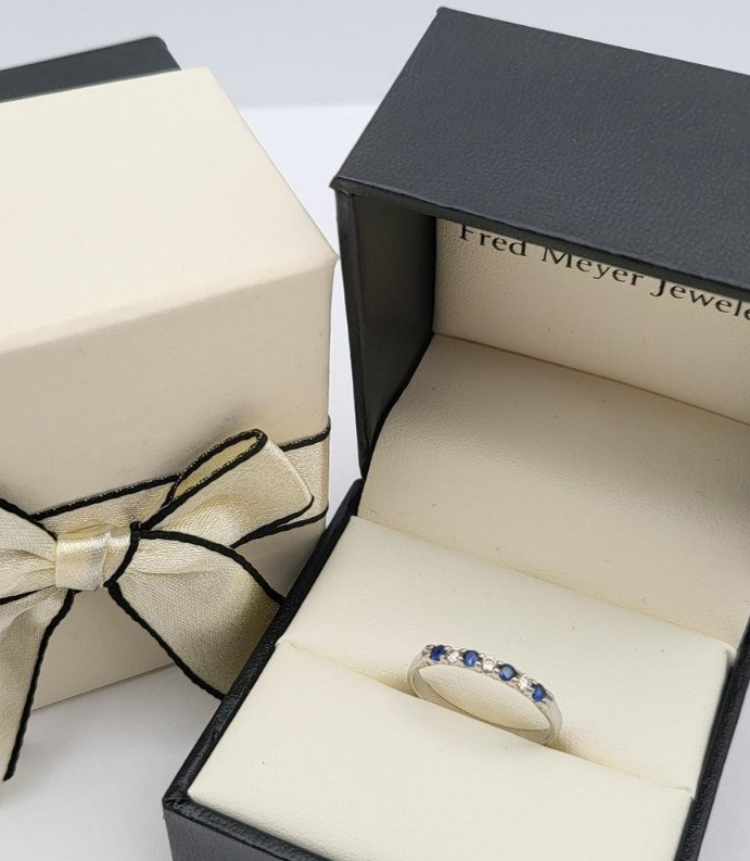 Fred Meyer Fine Jewelers, genuine round blue Sapphires (.15ct) & sparkly Diamonds (.11ct) set in 14k white gold. Stamped Kuber. Size 7.75. Total weight is 1.5 grams. Comes with ring box & gift box.