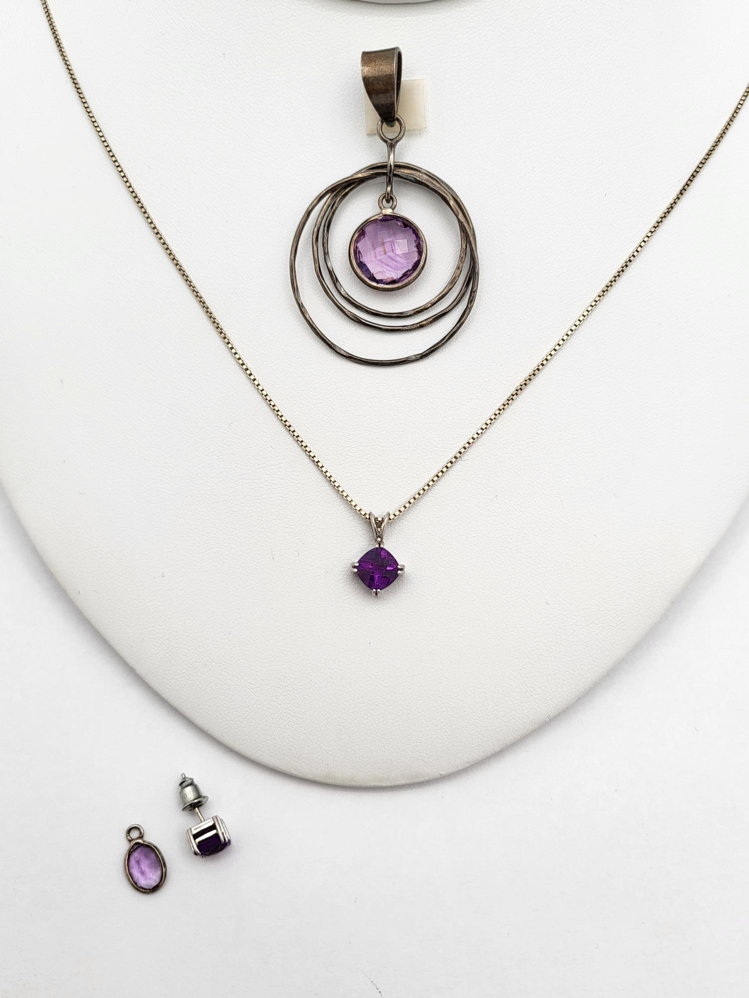 Several jewelry pieces with amethyst gems. Pendant with 925 silver tri-rings surrounding the amethyst, single gem pendant on chain, charm and single post earring.