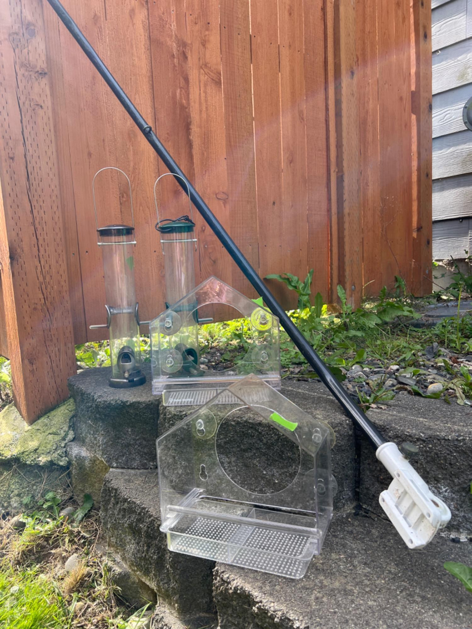 Cylinder Feeders 14” tall Bird Houses Acrylic 10” x 10” x 4.25” Hanger approximately 50” long mounts on fencing or side of house.