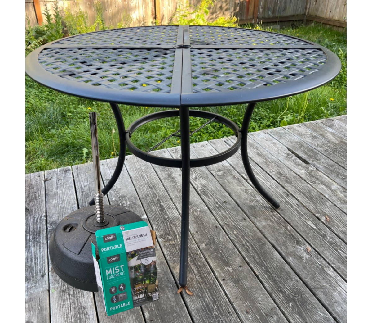 Black finish aluminum round patio table with center hole for umbrella. Included is an umbrella stand (plastic/fill with sand or water for support) and twinkle lights to line an umbrella. 18" plastic base for patio umbrella. Mist Cooling Kit.