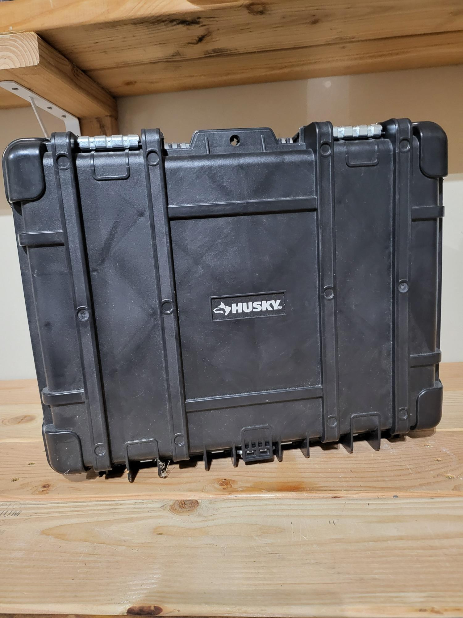 Husky brand black hard plastic utility tool organizer carry case with handle. Empty.