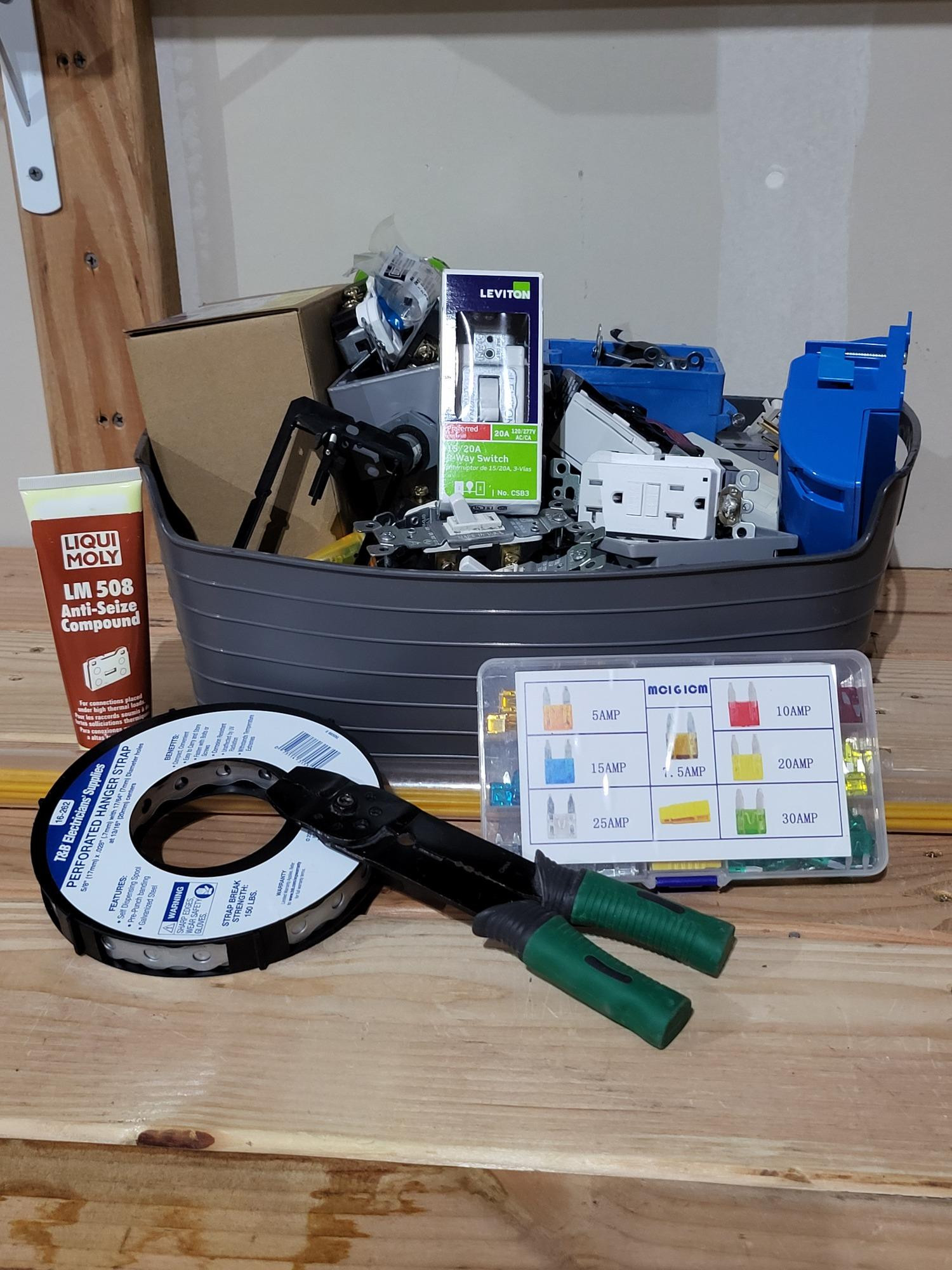 A delightful variety of electrical supplies ranging from wire to caps to electrical boxes and plugs and clippers.