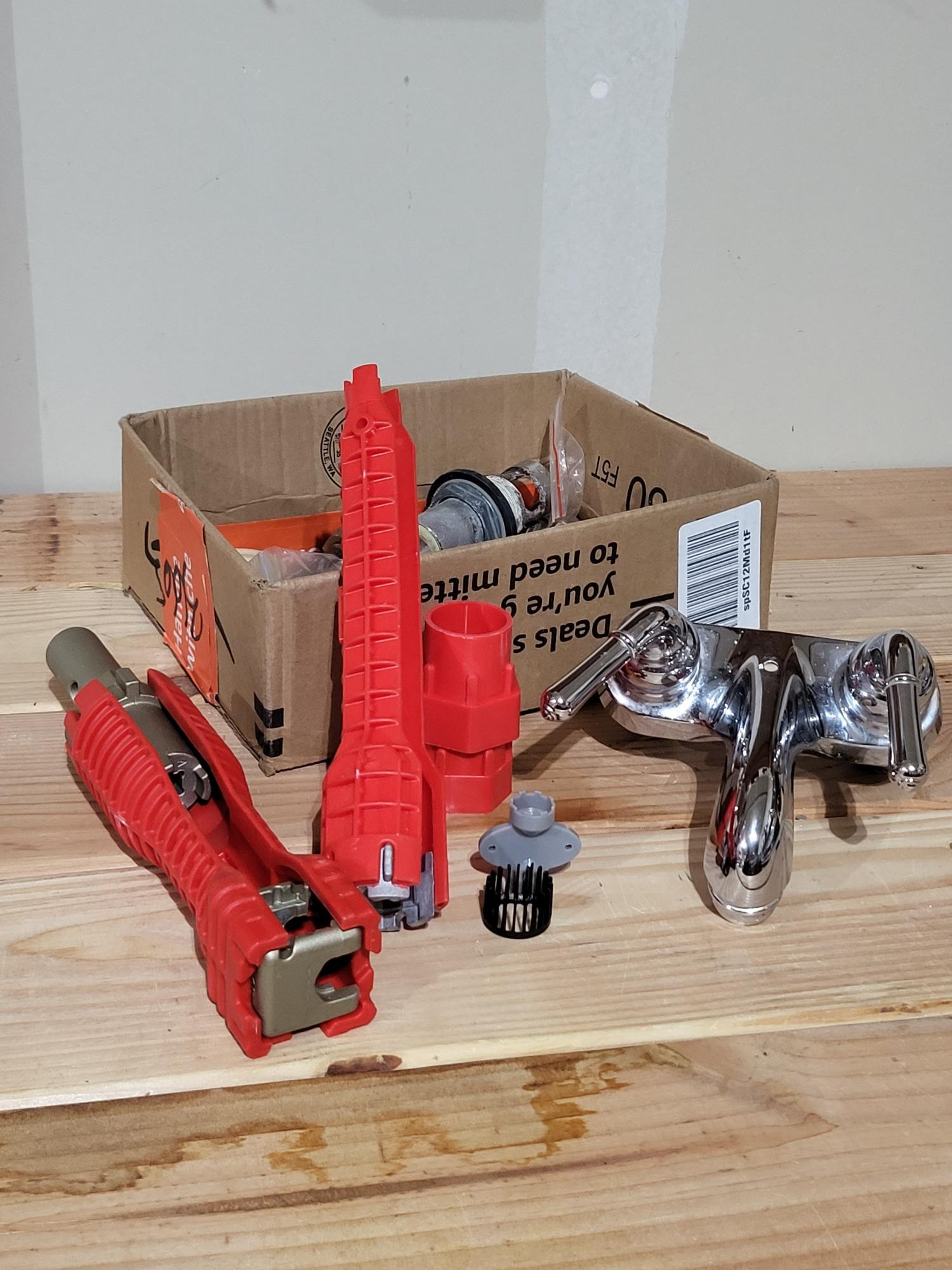 Sink hot/cold handled chrome faucet and sink wrench. Included are various plumbing tools and hardware.