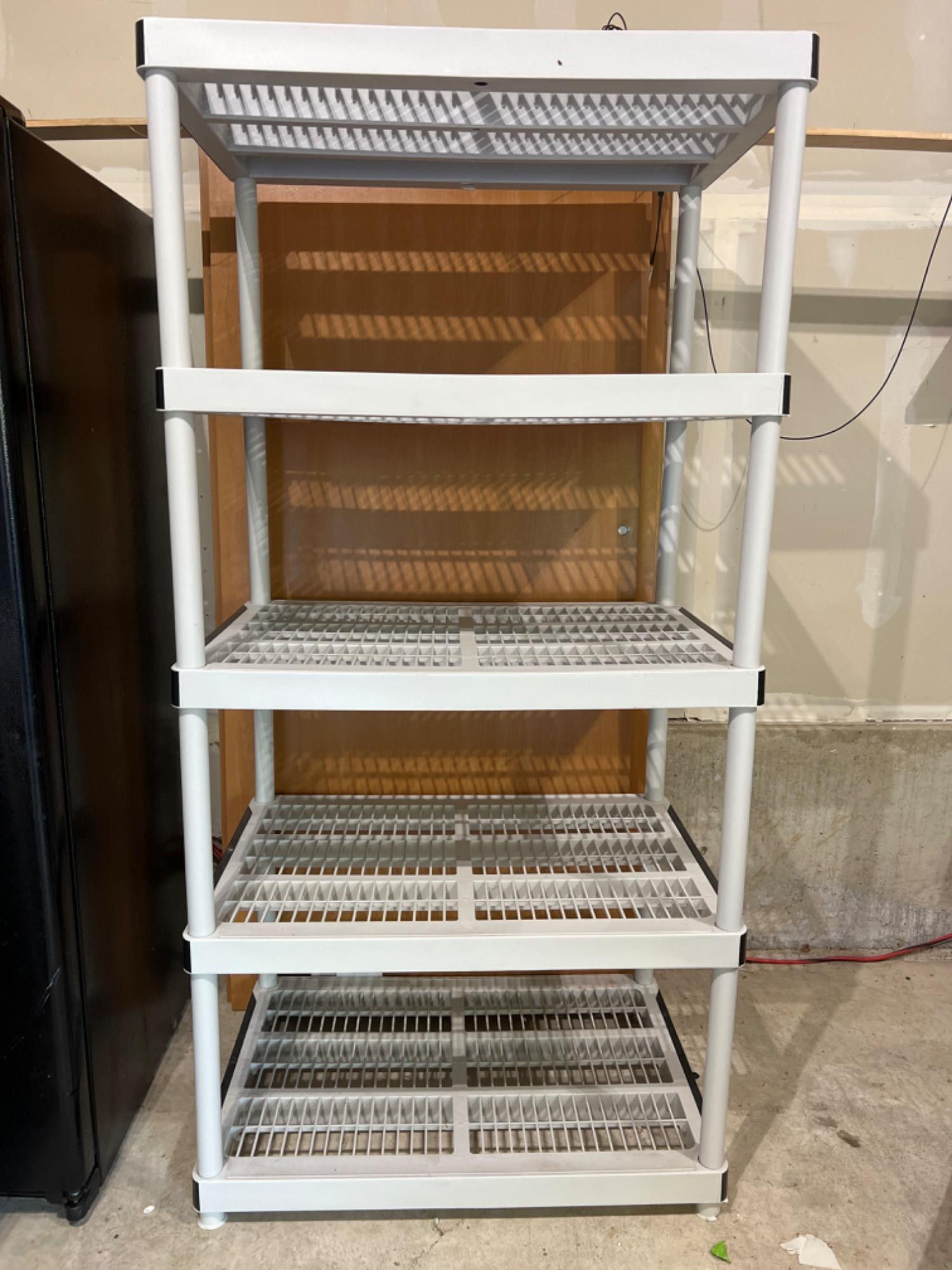 Storage Shelving Unit in gray toned plastic. 5 shelves and interlocking supports. See other lots with shelf organizers in this auction.