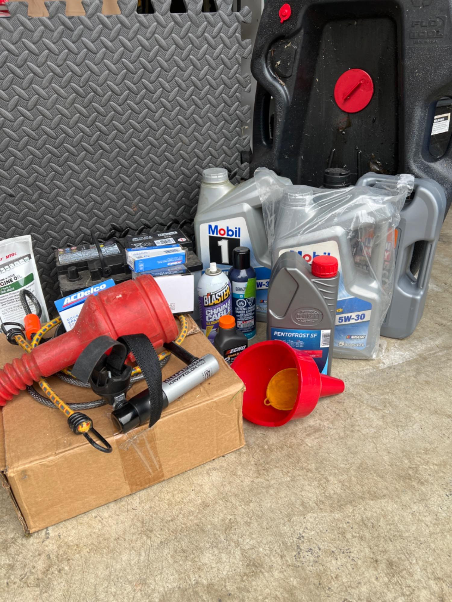 Automotive oil, Banner battery (untested), spark plugs and Oil container (that is full of waste oil at this time).