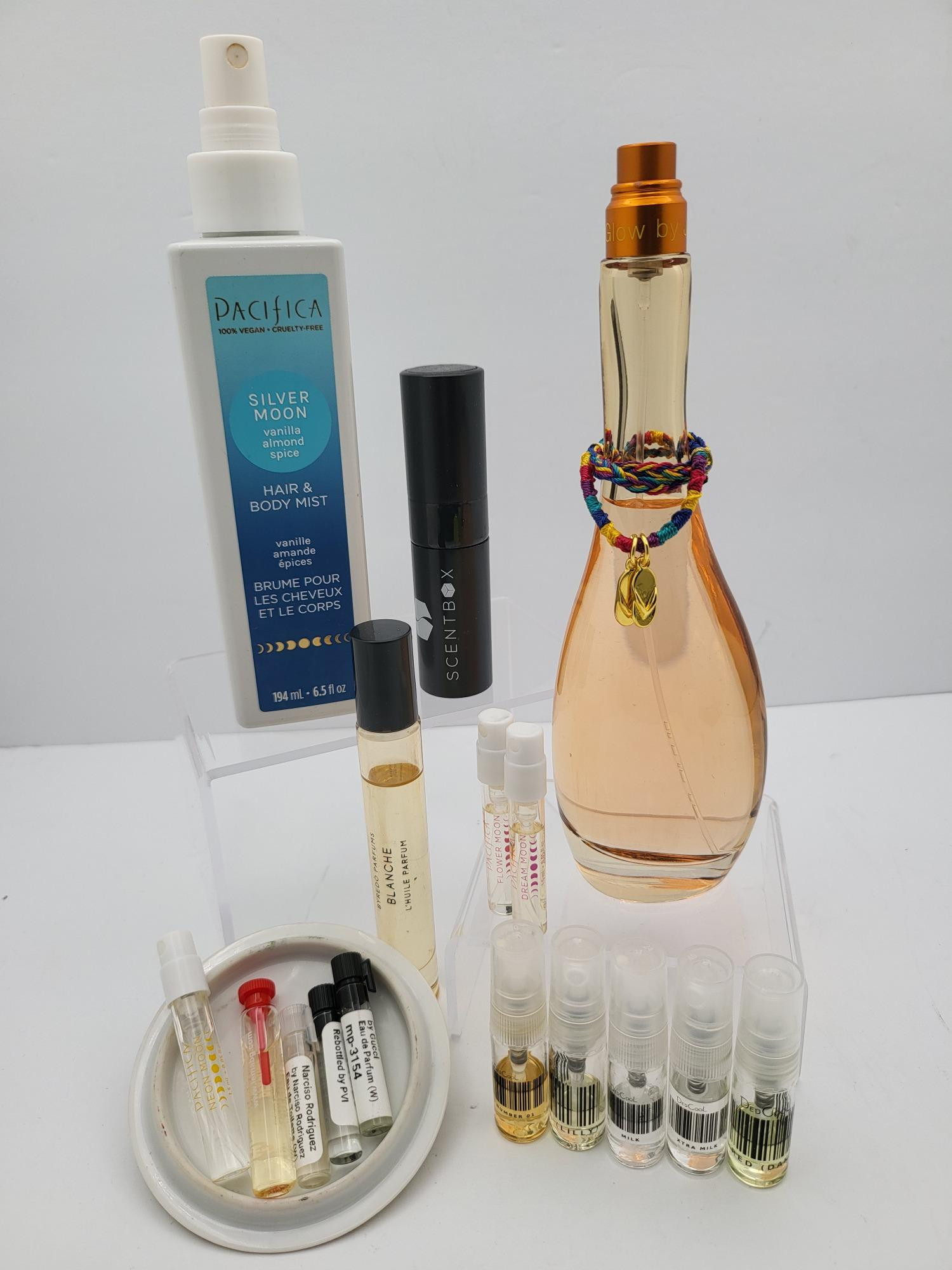 This perfume lot includes full size bottles and sample vials of various luxury scents: