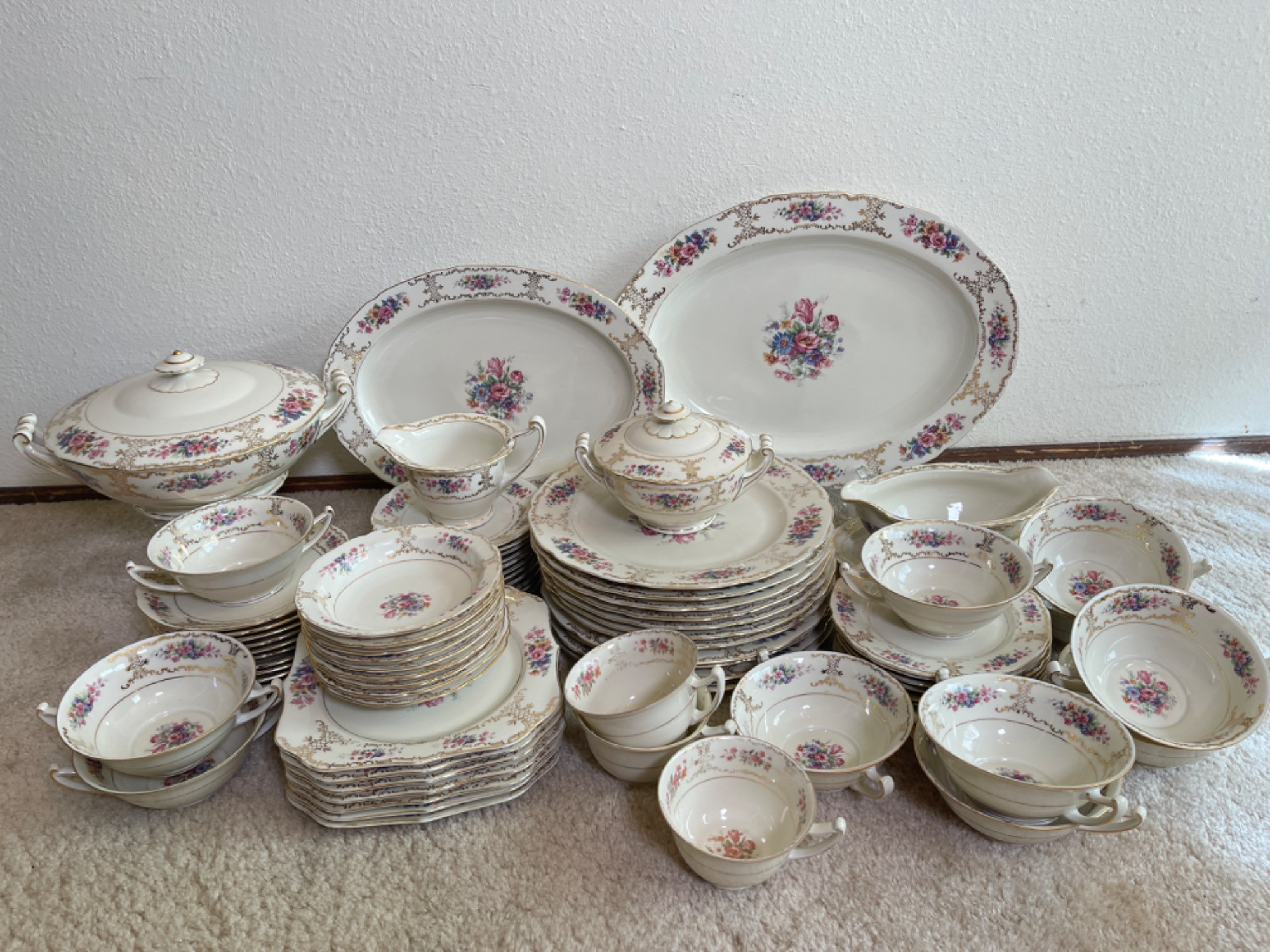 Beautiful Royal Epiag Czechoslovakia Floral & Gold Rimmed China Set All pieces have wearing off of design from use and age. A couple of pieces have some small chips, but majority is in good condition. Smallest: 3.75” W Largest: 15.5” W