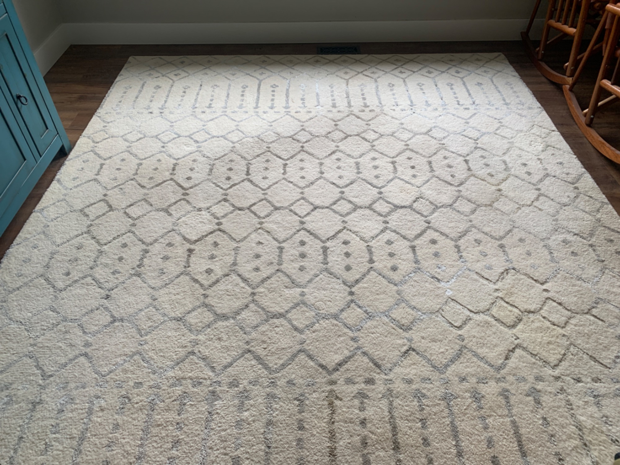 Safavieh10x8 area rug. Cream and Pewter colors. Recommend cleaning to freshen up, normal foot traffic residue. Looks like an old stain on underside.