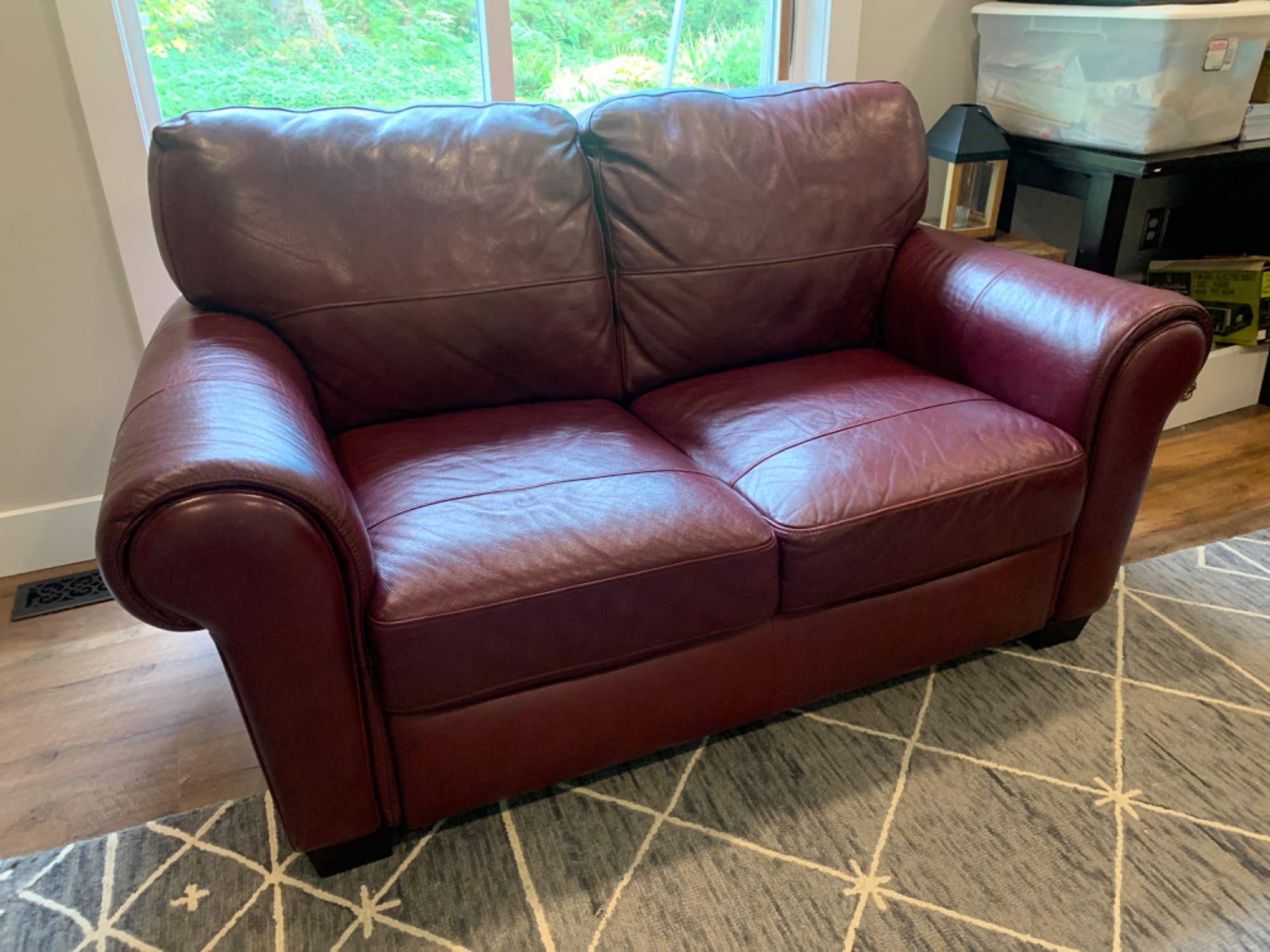 Leather loveseat in good condition. No damage found Cranberry/red color. Cushions are attached. Maker unknown. Heavy. Bring help and tools to load. Ground floor location. Will require removal of feet to access door.
