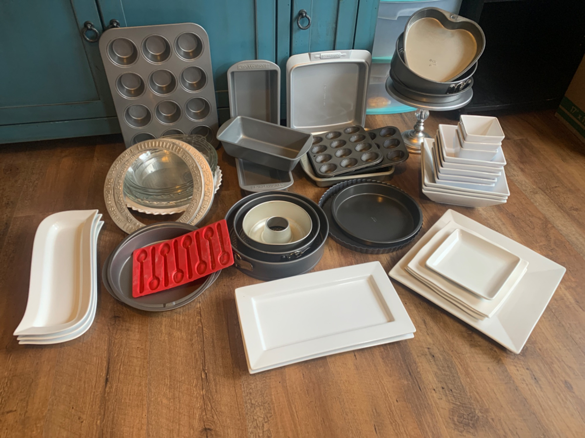 Large variety of new and used baking pans, accessories. White serving dishes in variety of shapes and styles. See pics for details.