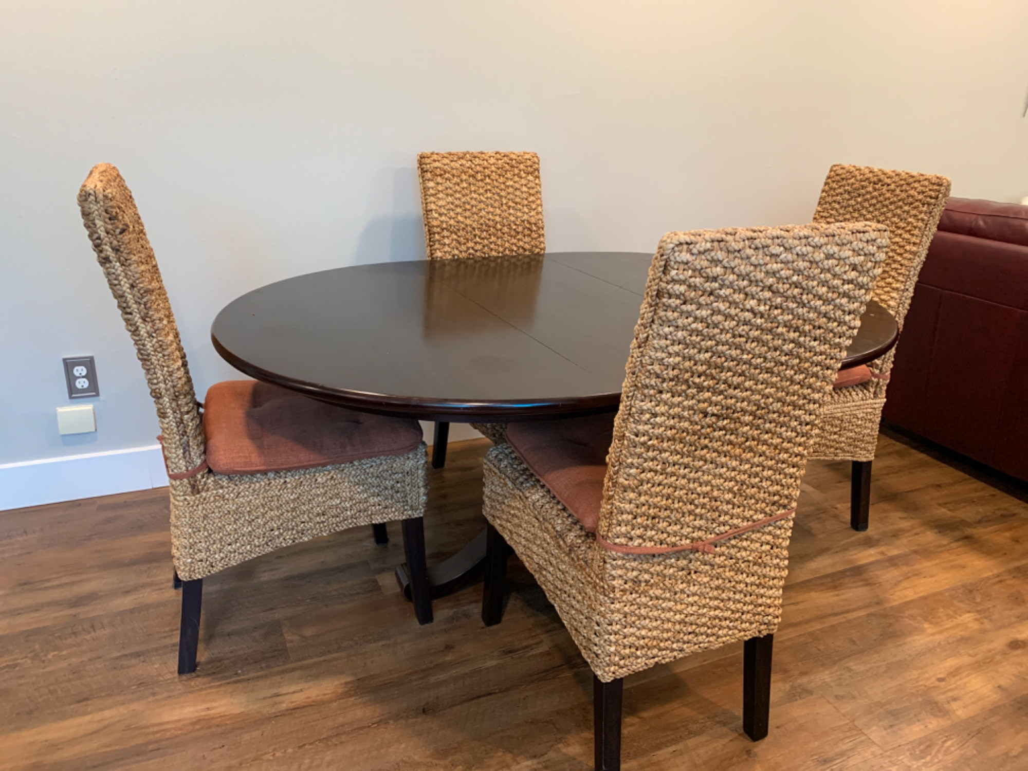 Dark pedestal dining table. Length includes with leaf in. Heavy woven chairs with seat cushions. Cozy set in good condition. Ground floor location. Bring help to load.